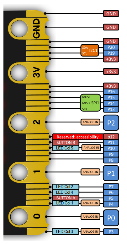 The edge connector breaks out the GPIO and power pins. Note that some pins serve dedicated functions.