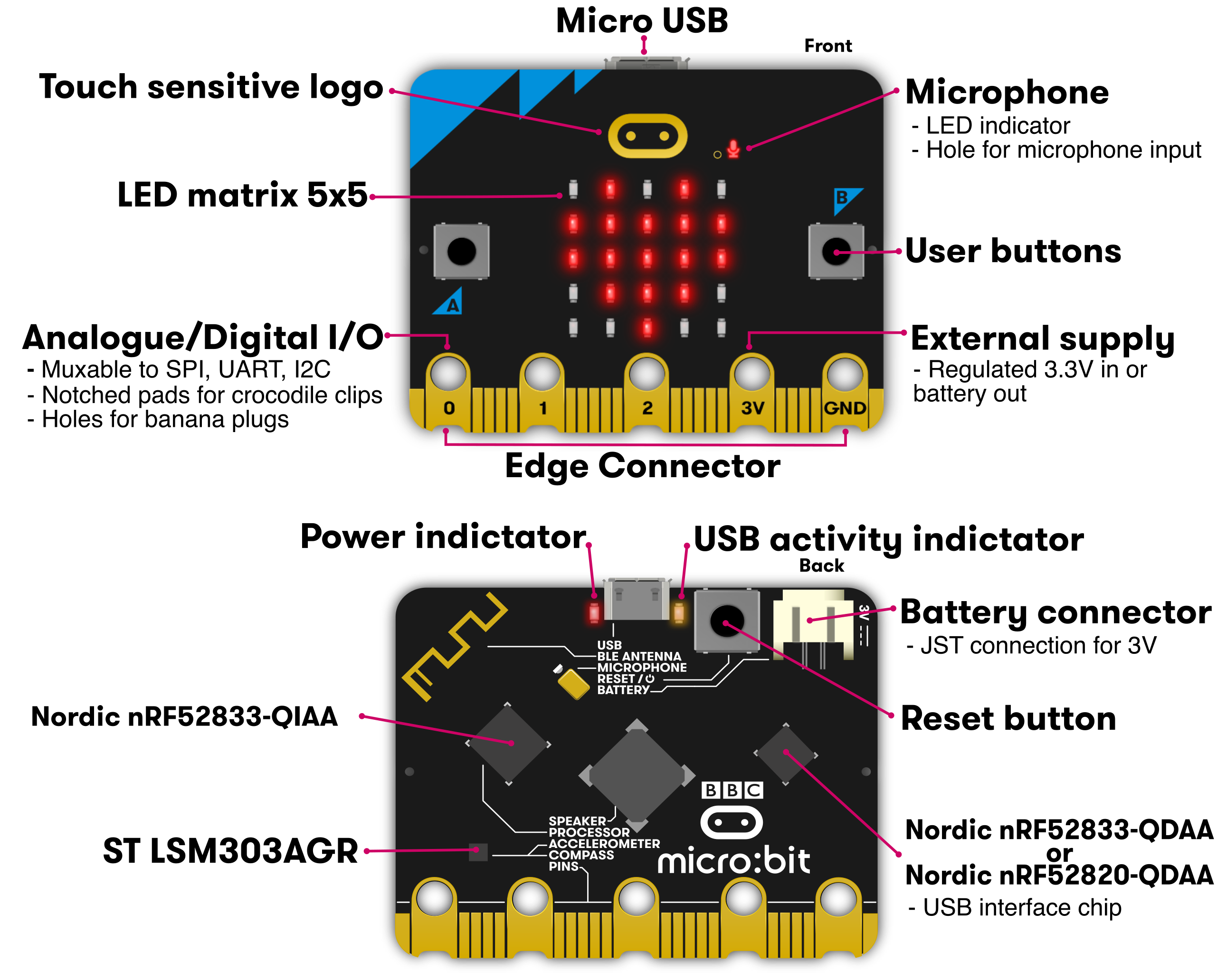 The micro:bit is equipped with a Nordic nRF52833 microcontroller which includes: