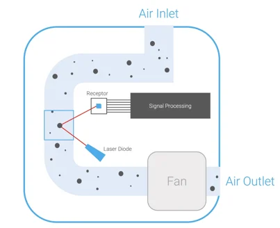 Particulate-matter (PM) sensors detect tiny solid or liquid particles suspended in air, such as dust, pollen, smoke, or pollution. The most common method is optical scattering, where an LED light beam passes through air and a photodetector measures the intensity of light scattered by particles. These sensors classify particle sizes (such as PM2.5 or PM10) and are widely used in air purifiers, environmental monitoring, and health-safety devices.