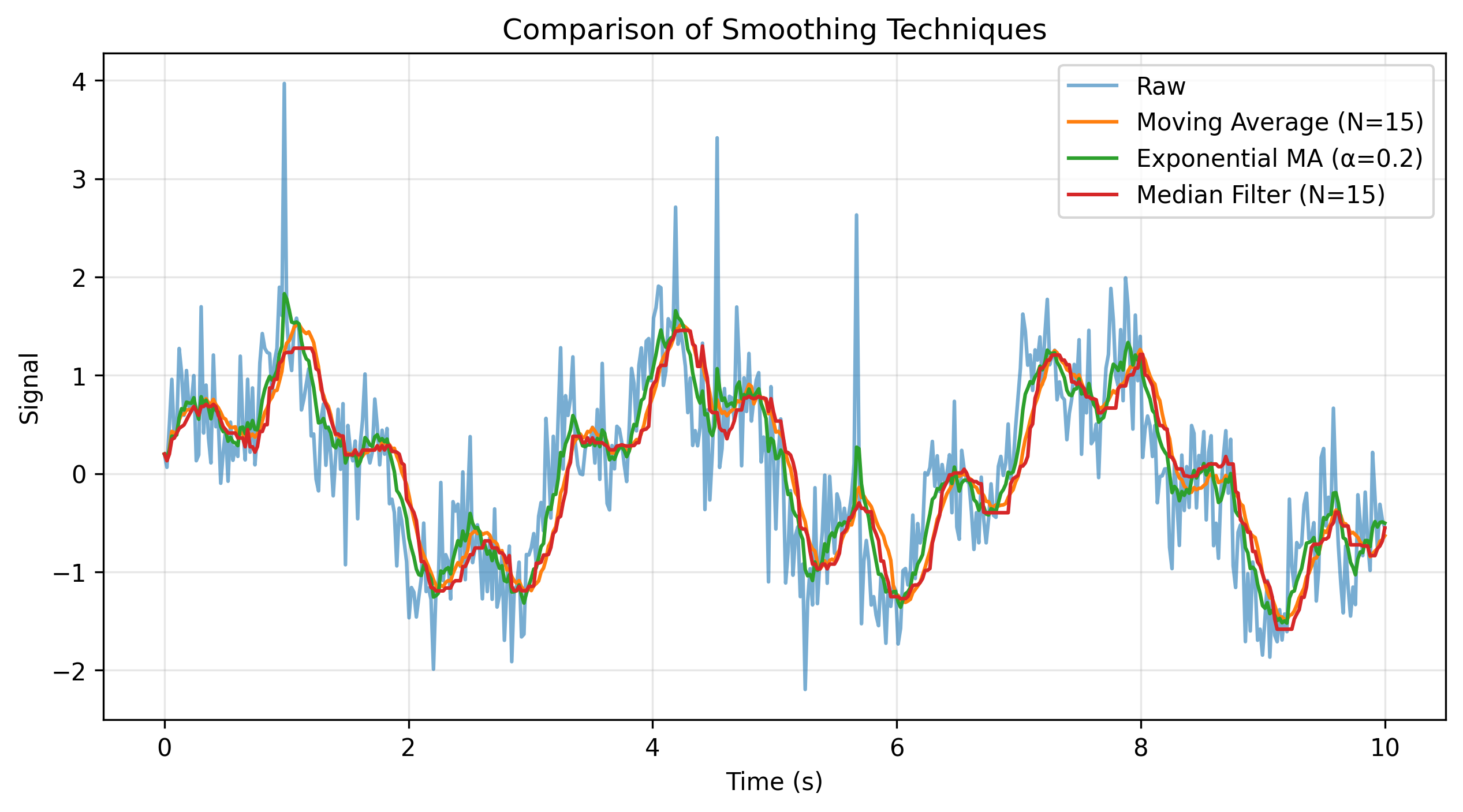 One of the simplest methods is a moving average, where the program remembers the last few samples and calculates their mean. Random spikes disappear, and the signal becomes easier to use. The trade-off is that the output reacts more slowly to sudden changes.