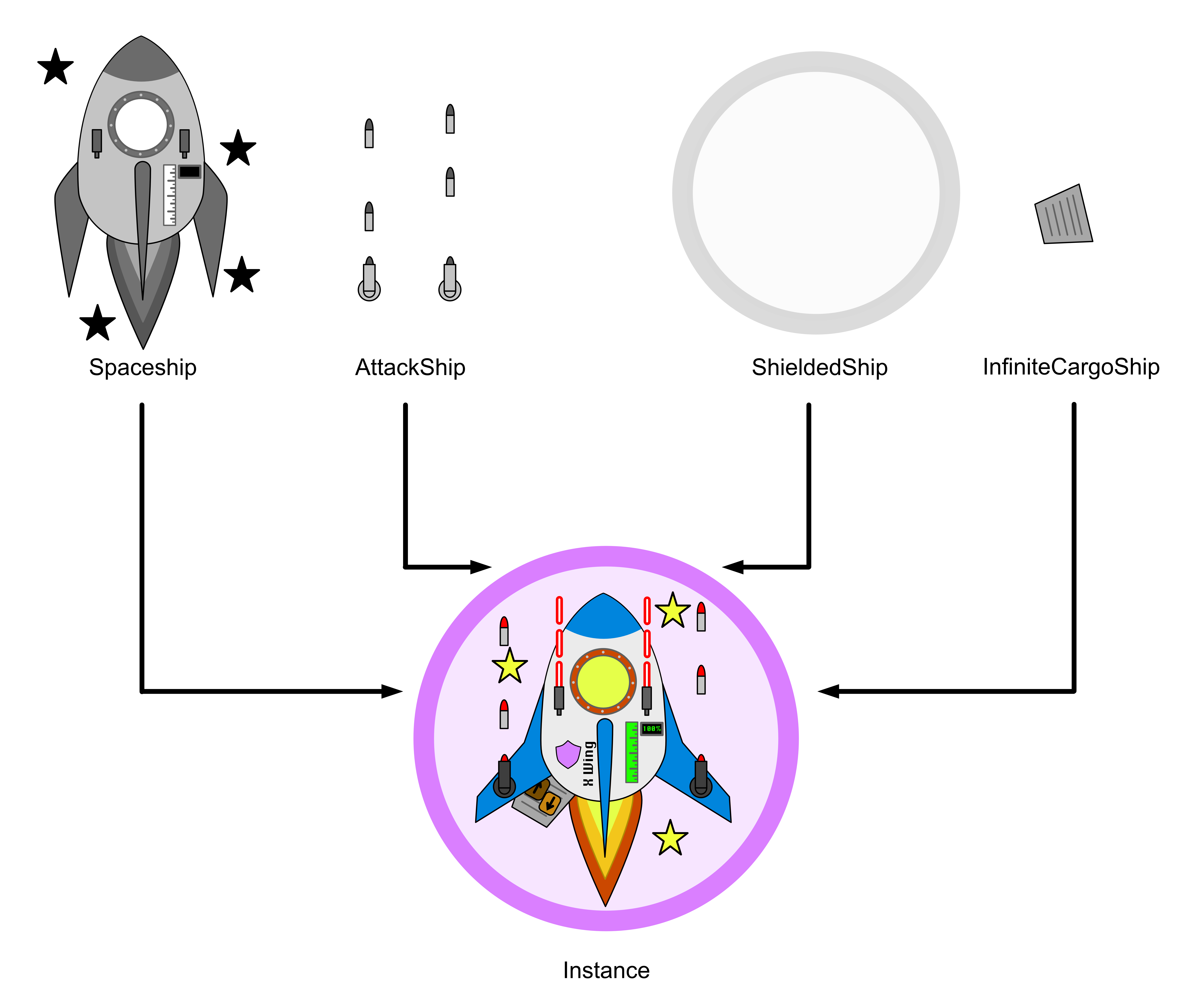 Spaceshipas providedAttackShipas providedShieldedShipInfiniteCargoShip