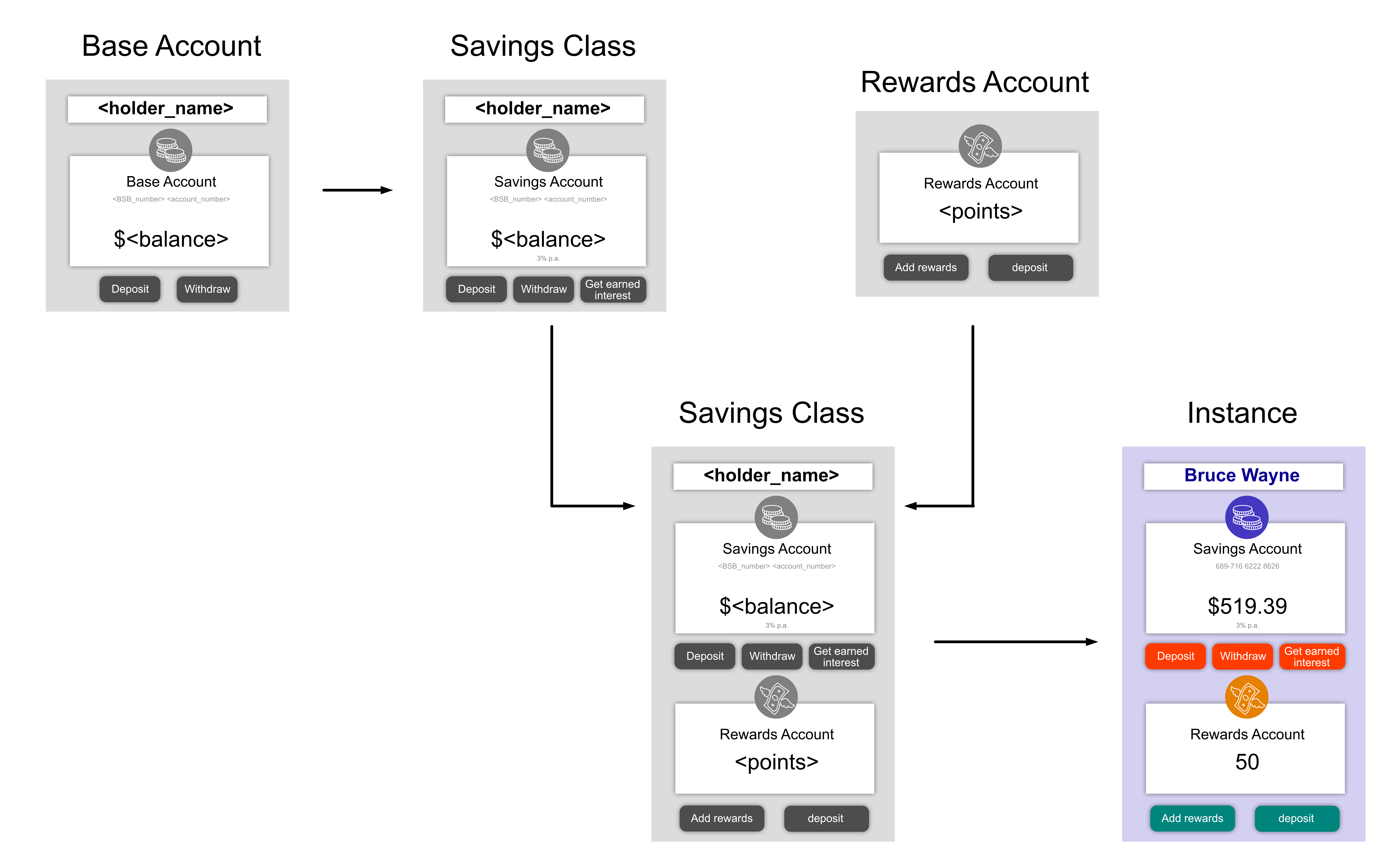 Let’s look at a complete example of multiple inheritance using the bank account context.
