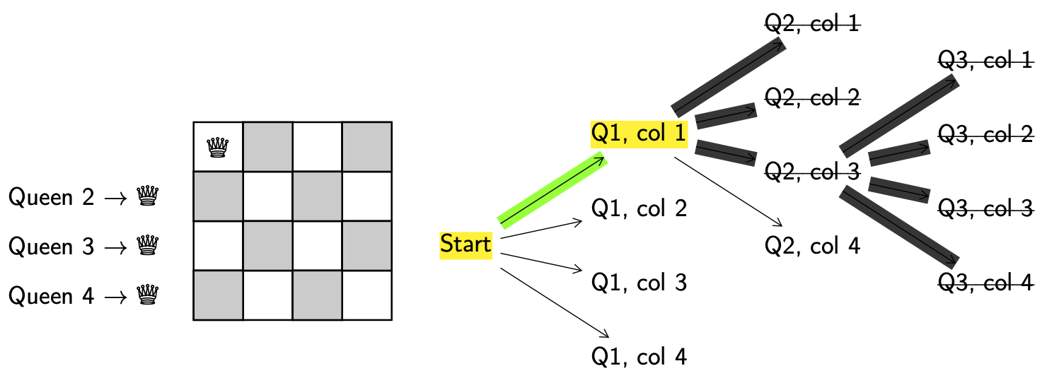 What you’ll probably have notices is that putting queen 3 on the board in column 3 or 4 results in invalid configurations. We are at another dead end! This means we now need to backtrack further all the way back to decision point (Q1, col 1).