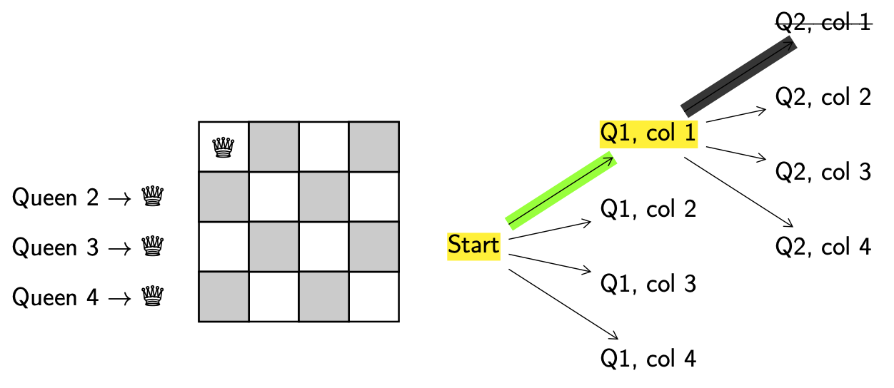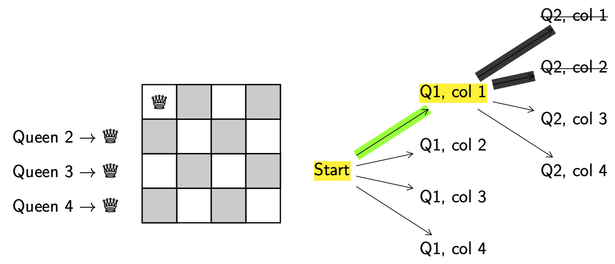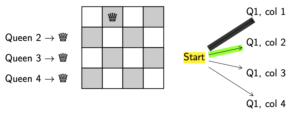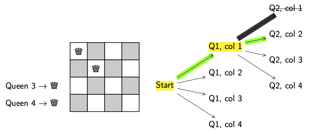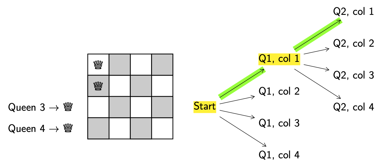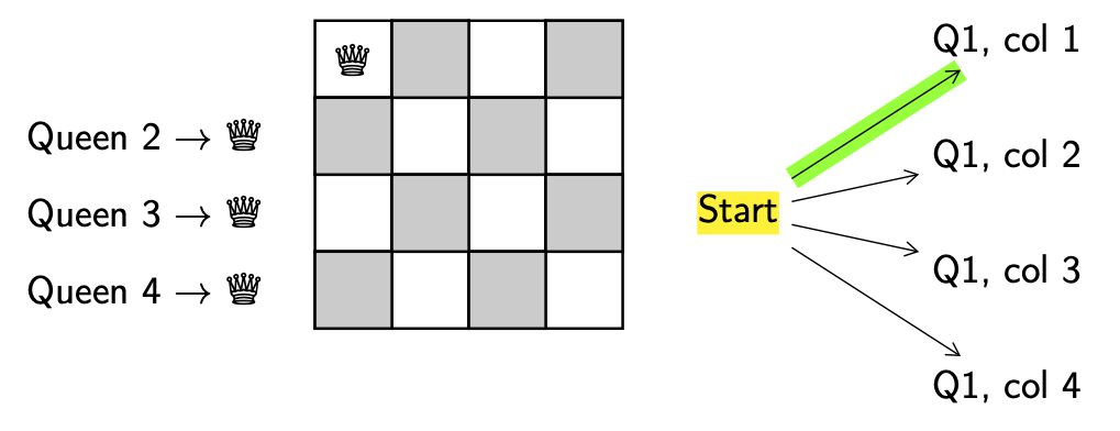 Decision. We need to decide which queen to move and where to move it to. For simplicity we’ll always try to add the next lowest-numbered queen and always try to put them in the left-most column. When a decision has been made we’ll keep track of it by highlighting the decision point (start) in yellow.