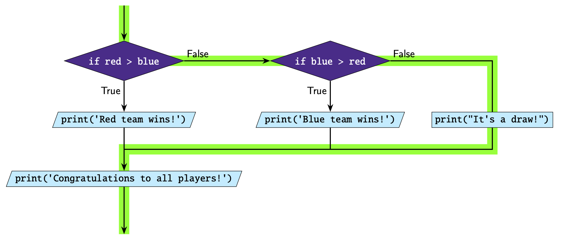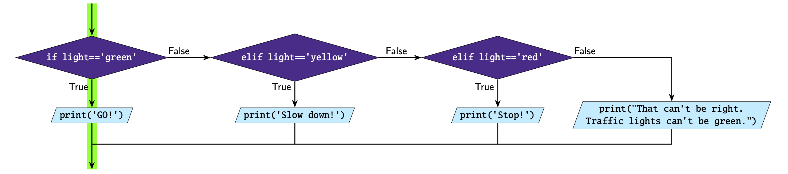 Consider the two programs below. They are similar but not quite the same. If you set the variable light to 'yellow', both programs will print Slow down!.
