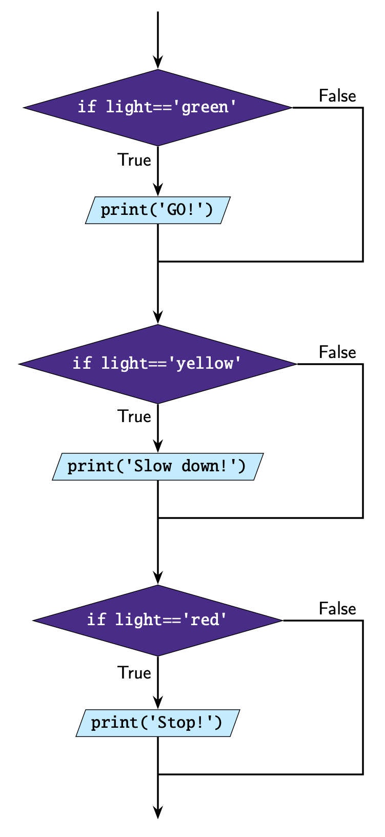 IF light == 'green' THEN Display 'GO!' ELSEIF light == 'yellow' THEN Display 'Slow down!' ELSEIF light == 'red' THEN Display 'Stop!' ENDIFIF light == 'green' THEN Display 'GO!' ELSEIF light == 'yellow' THEN Display 'Slow down!' ELSE Display 'Stop!' ENDIFIF light == 'green' THEN Display 'GO!' ELSE IF light == 'yellow' THEN Display 'Slow down!' ELSE IF light == 'red' THEN Display 'Stop!' ELSEIF light == 'green' THEN Display 'GO!' ENDIF IF light == 'yellow' THEN Display 'Slow down!' ENDIF IF light == 'red' THEN Display 'Stop!' ENDIF