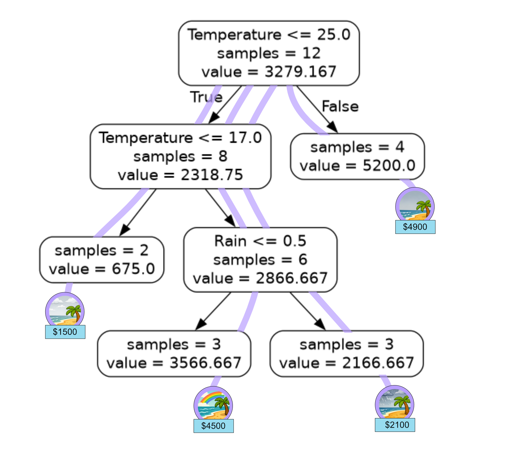 We can verify our models predictions by looking at how the test samples flow through our regression tree.