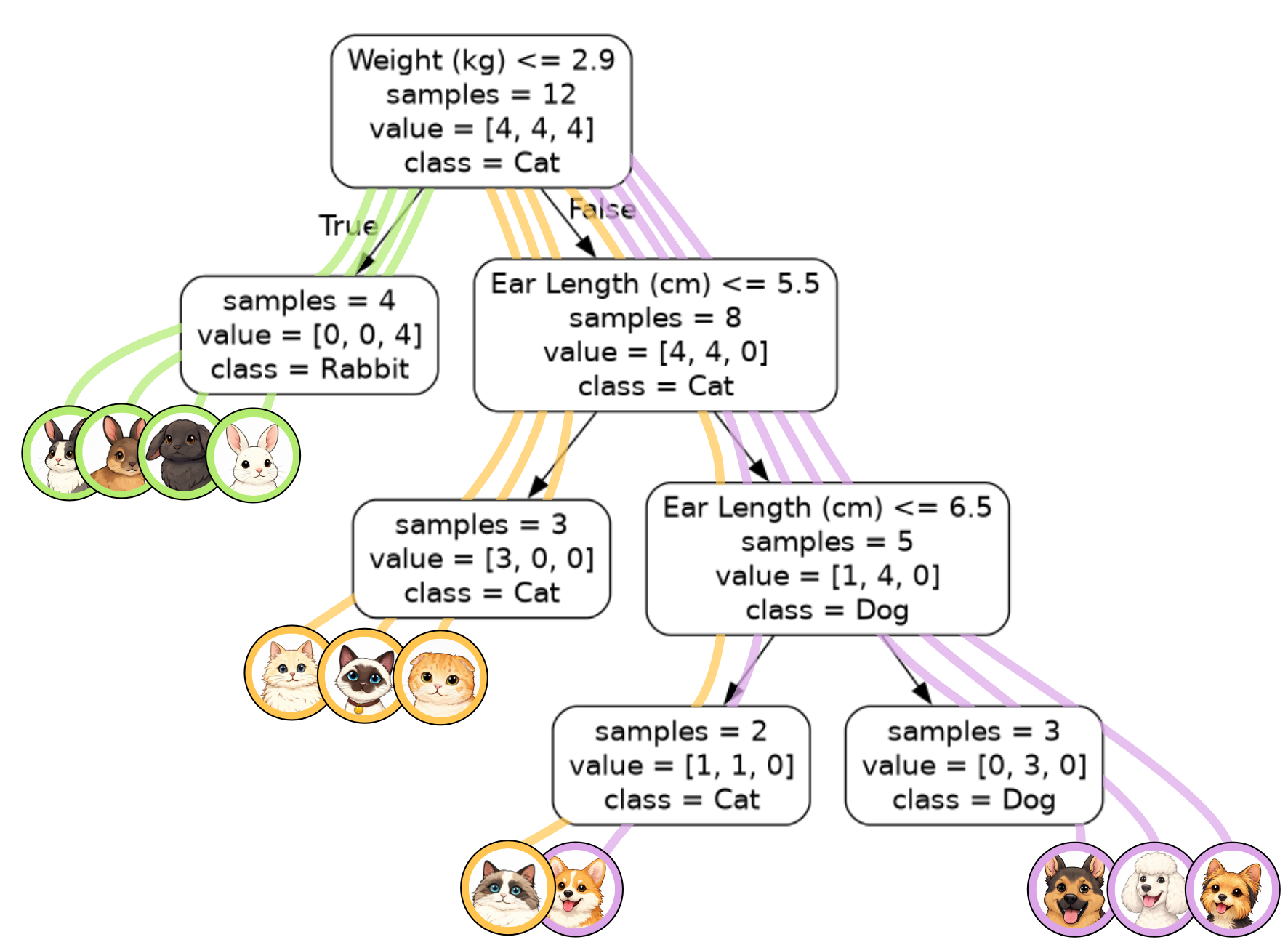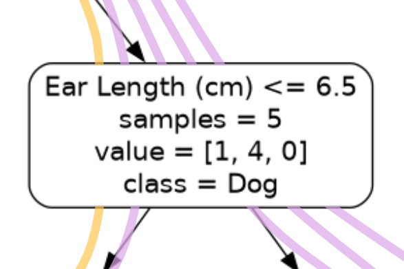 Ear Length (cm) <= 6.5is the decision associated with the node.samples = 5means that 5 samples have ‘flowed’ through this node. This corresponds to the 5 lines passing through the node in our visualisation.value = [1, 4, 0]tells you that there were 1 cat, 4 dogs and 0 rabbits that ‘flowed’ through this node. Again, you can tell by the colours of the lines. There is one yellow line for the cat and 4 purple lines for the dogs. The order of the list corresponds to the order of the class labels. In our case we had 1: cat, 4: dog, 0:rabbit.class = Dogmeans that the majority of the samples passing through this node belong to the dog class. In instances where there is a tie between classes, the class associated with the lowest number will be selected. E.g.[4, 4, 0]has equal cats (0) and dogs (1), so we default to cats.