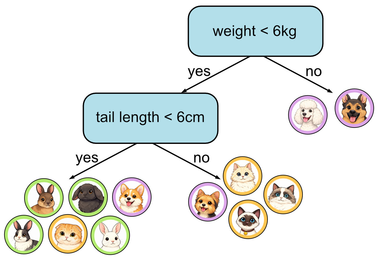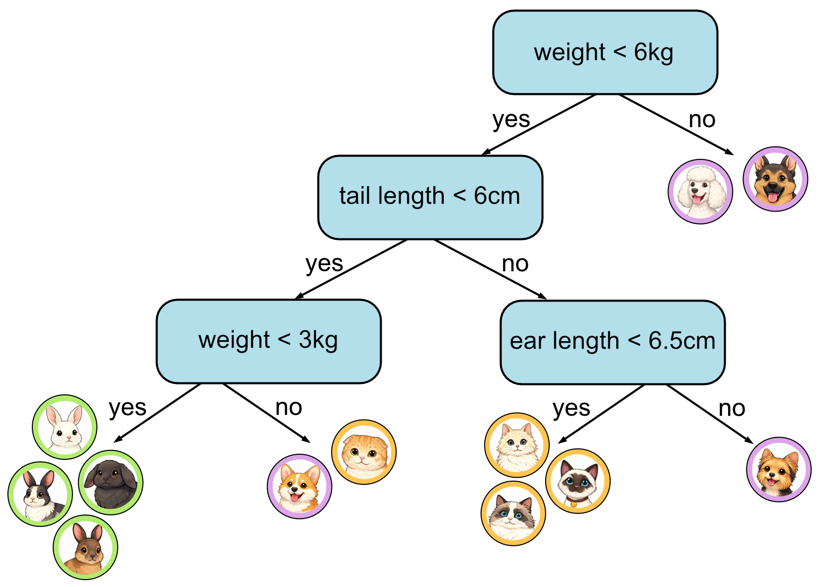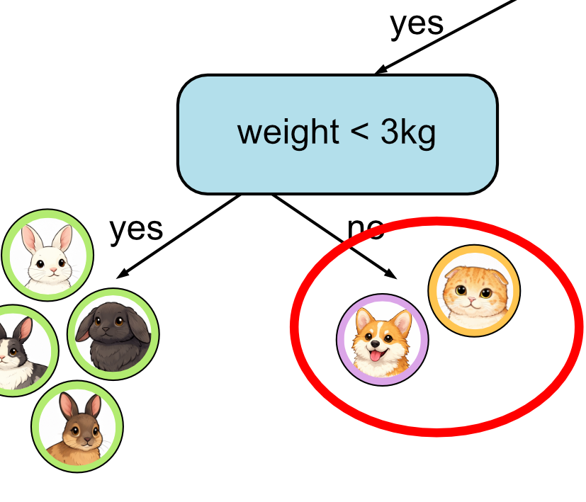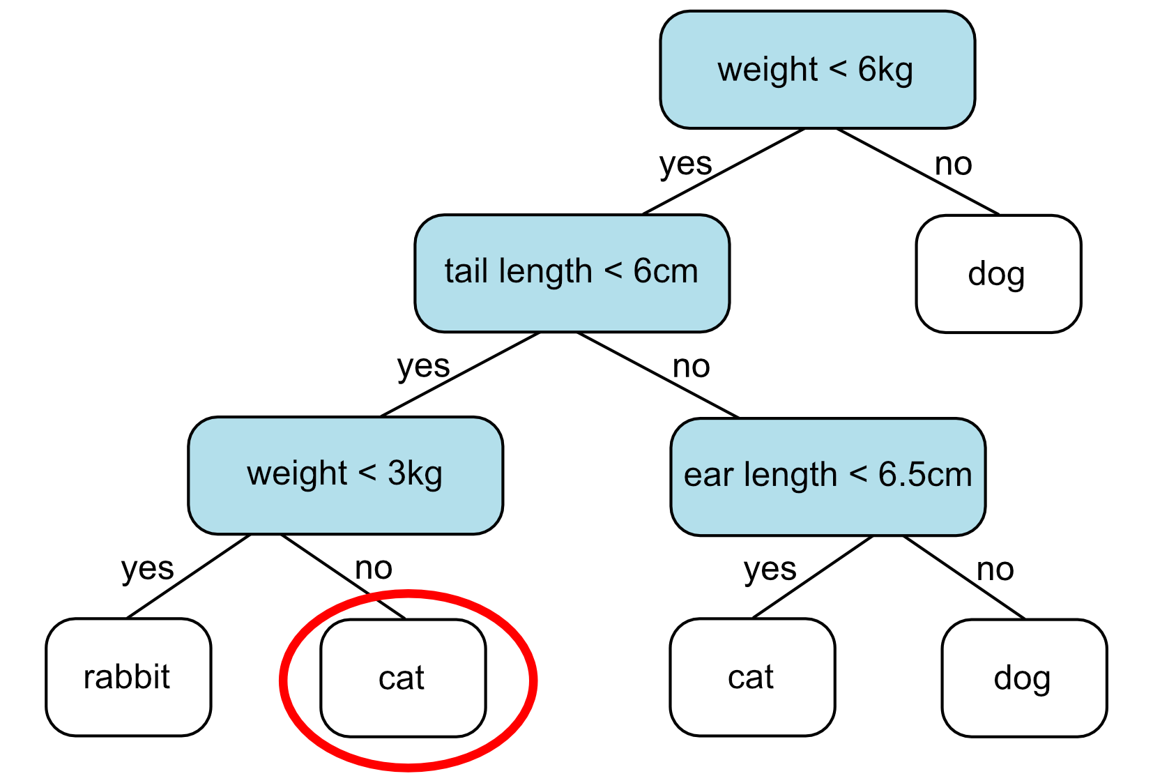 What you’ll notice is though is that this time some of our decisions don’t lead to a leaf node with a single class. This is what we call an impure node. If there are more training samples from one class that end up in this node, we label this node with the majority class. E.g. if there were two cats and one dog, we’d label this cat. In this example however, there are an equal number of dogs and cats. This is less likely to happen when there is more training data, but in this case we can choose randomly, each is equally valid. For this example, we’ll just choose cat.