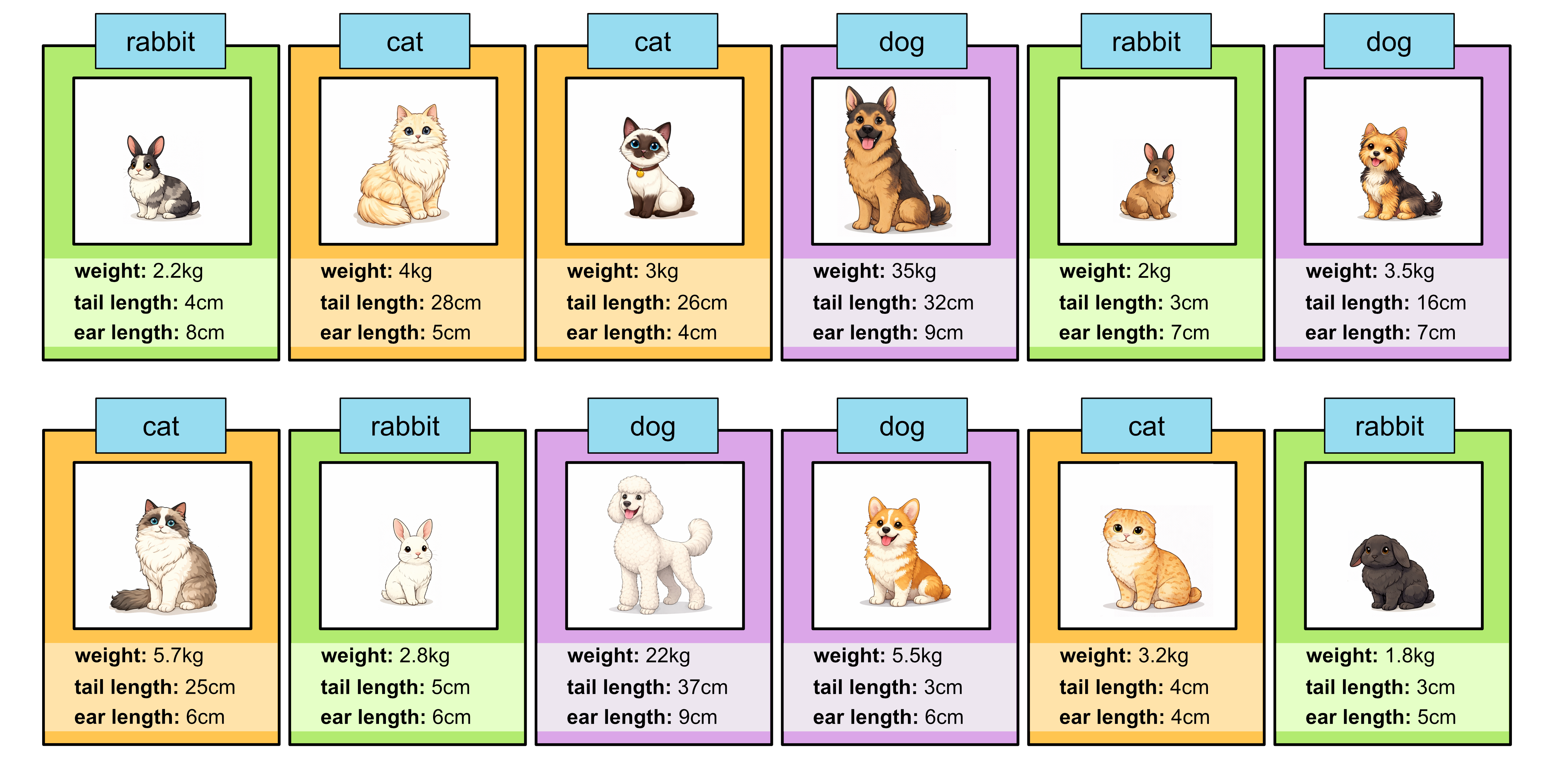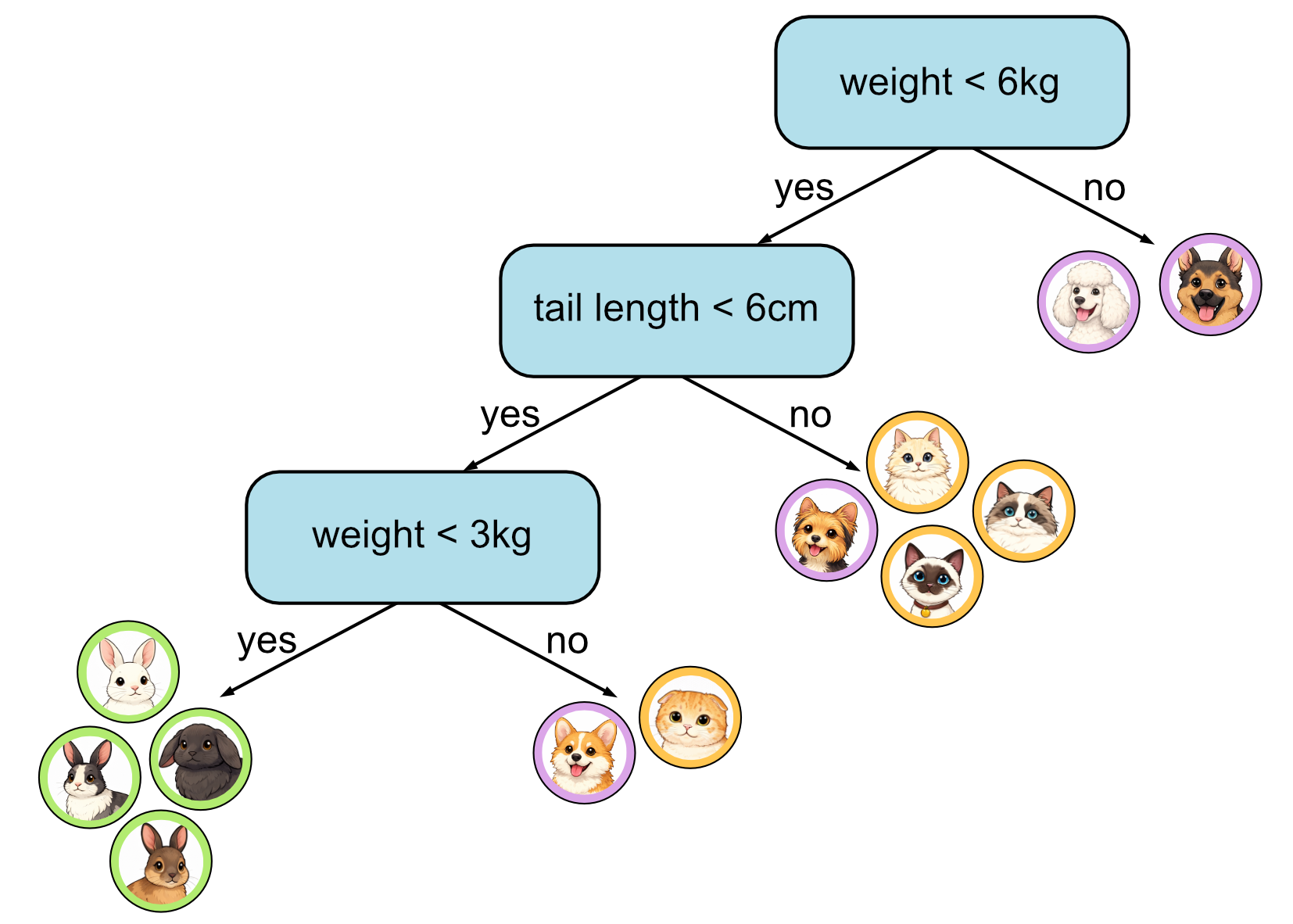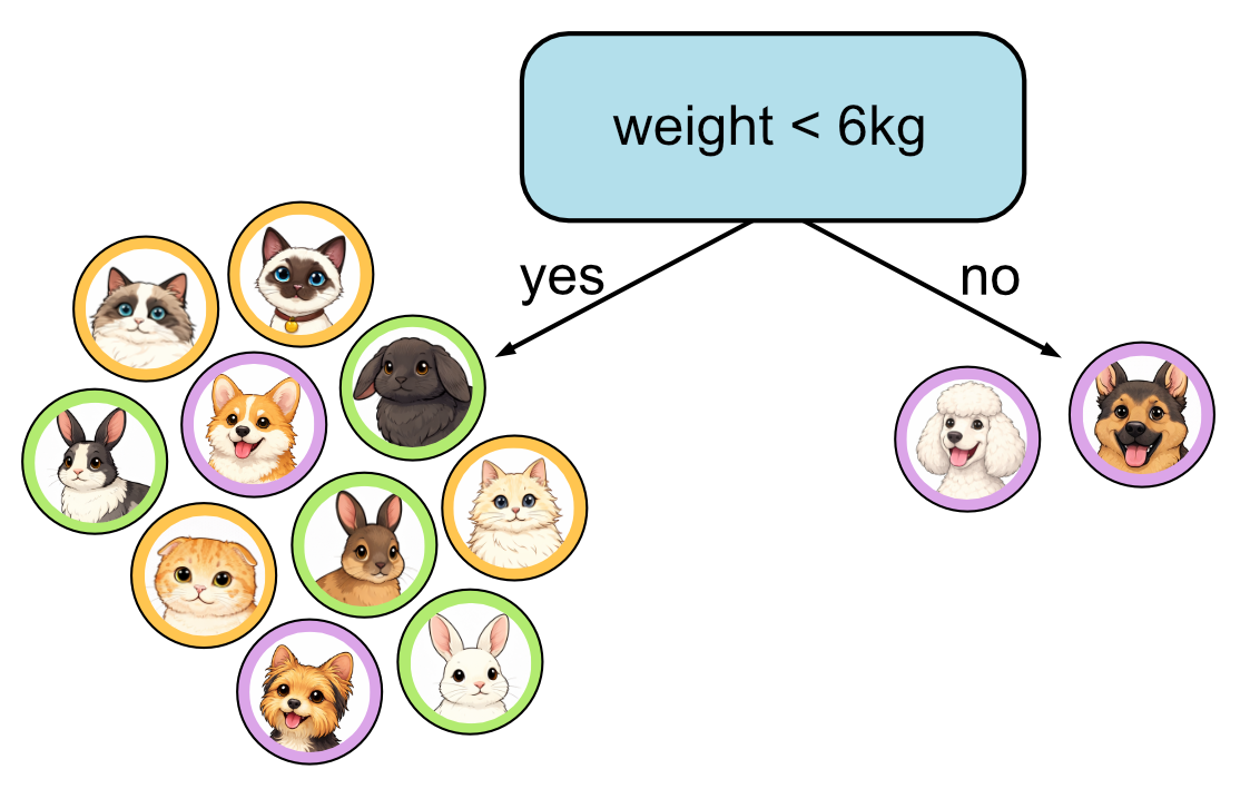 What you’ll notice is though is that this time some of our decisions don’t lead to a leaf node with a single class. This is what we call an impure node. If there are more training samples from one class that end up in this node, we label this node with the majority class. E.g. if there were two cats and one dog, we’d label this cat. In this example however, there are an equal number of dogs and cats. This is less likely to happen when there is more training data, but in this case we can choose randomly, each is equally valid. For this example, we’ll just choose cat.