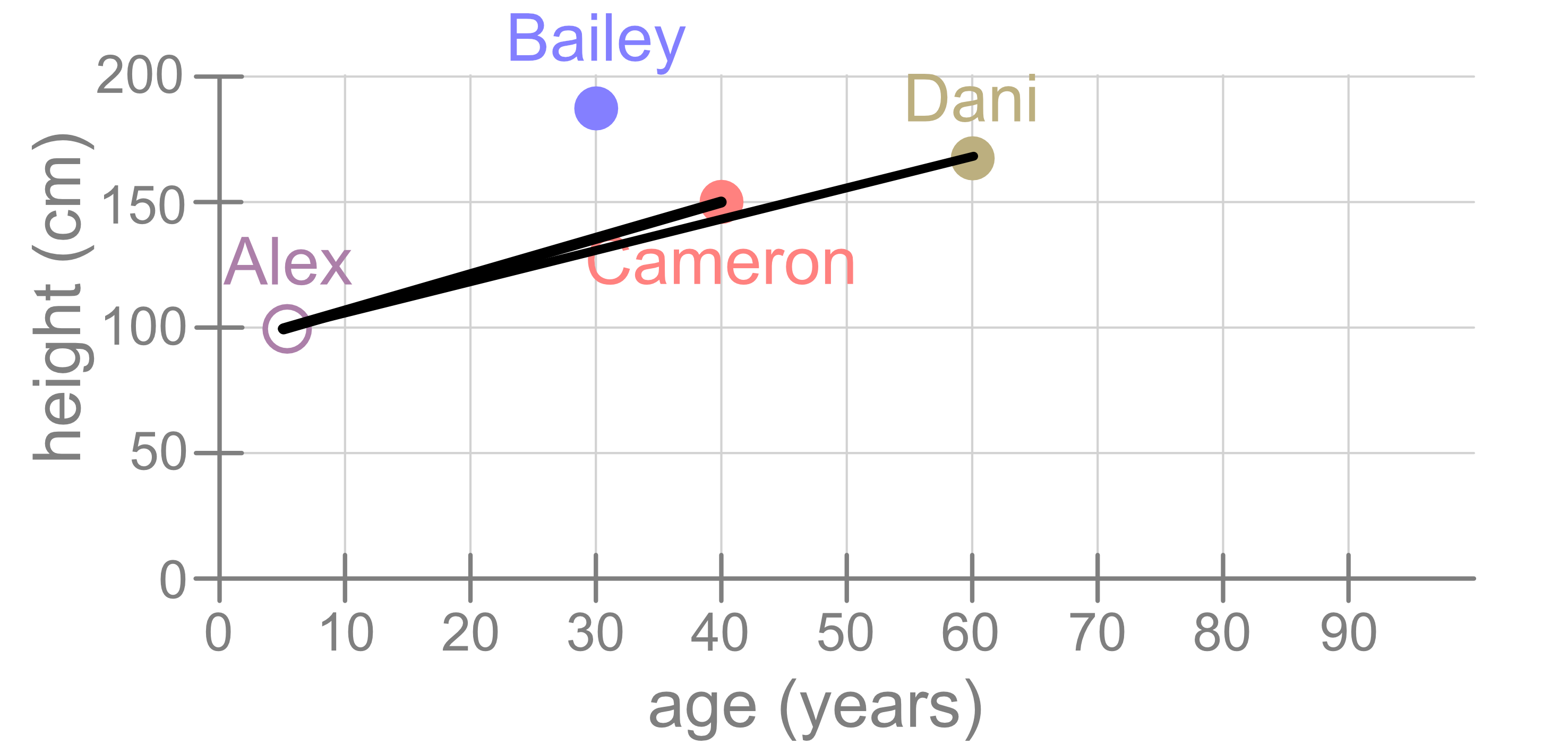 In general, if you consider a larger dataset, the points that are close together are similar in both age and height. The closer the points are, the more similar they are. If two people are similar in one variable but quite different in another variable (e.g. similar height but different ages), they won’t necessarily be close together.