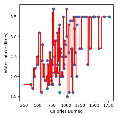 We will use the Calories column (the number of calories burned during the exercise) to predict the amount of water the person drank in litres.