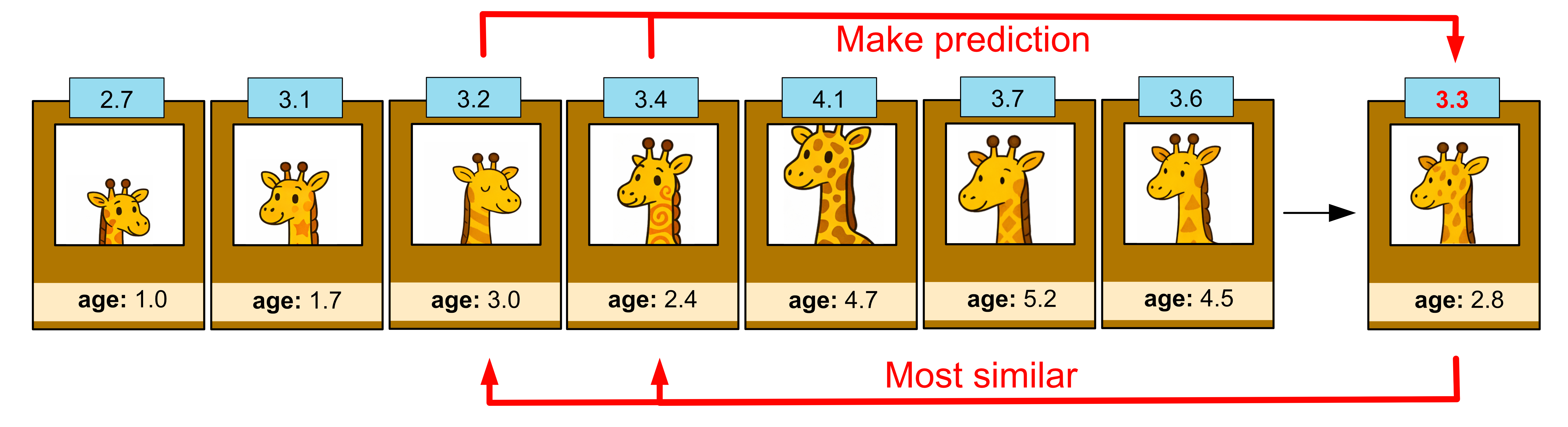 The two giraffes that are most similar in age are 2.4 and 3.0 years old. They have heights 3.2 and 3.4. The average of these values is 3.3, so we predict our giraffe is 3.3m tall.