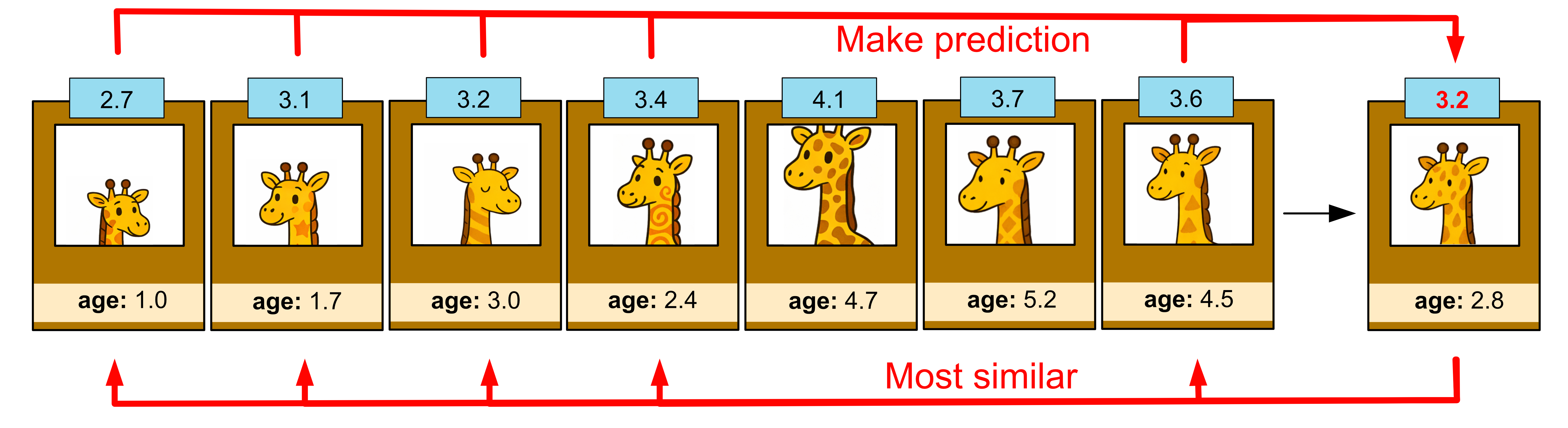 This giraffe happens to have a height of 3.2m. Thus, we predict that our giraffe is 3.2m tall.