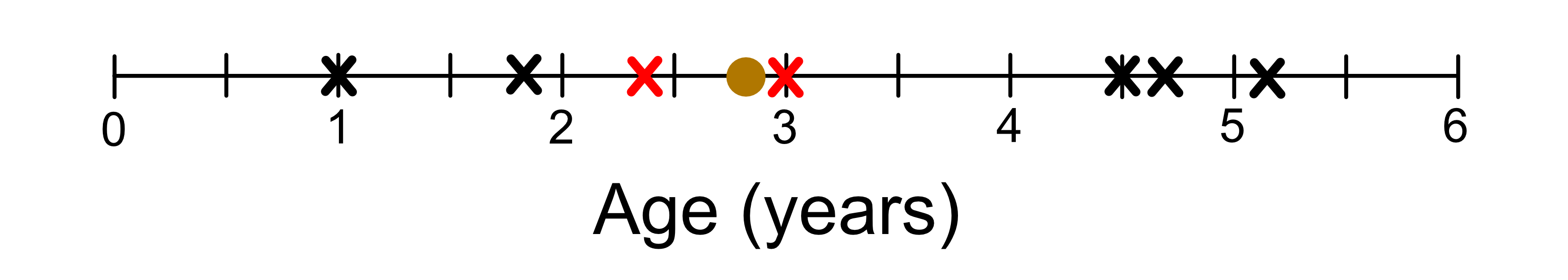 Now the way a KNN regression model makes a prediction is that it looks for the closest sample in the training data. For example, let’s say we wanted to predict the height of a giraffe who was 2.8 years old. The information we have on our unknown giraffe is just it’s age. If we were to plot just the age information it would look like this: