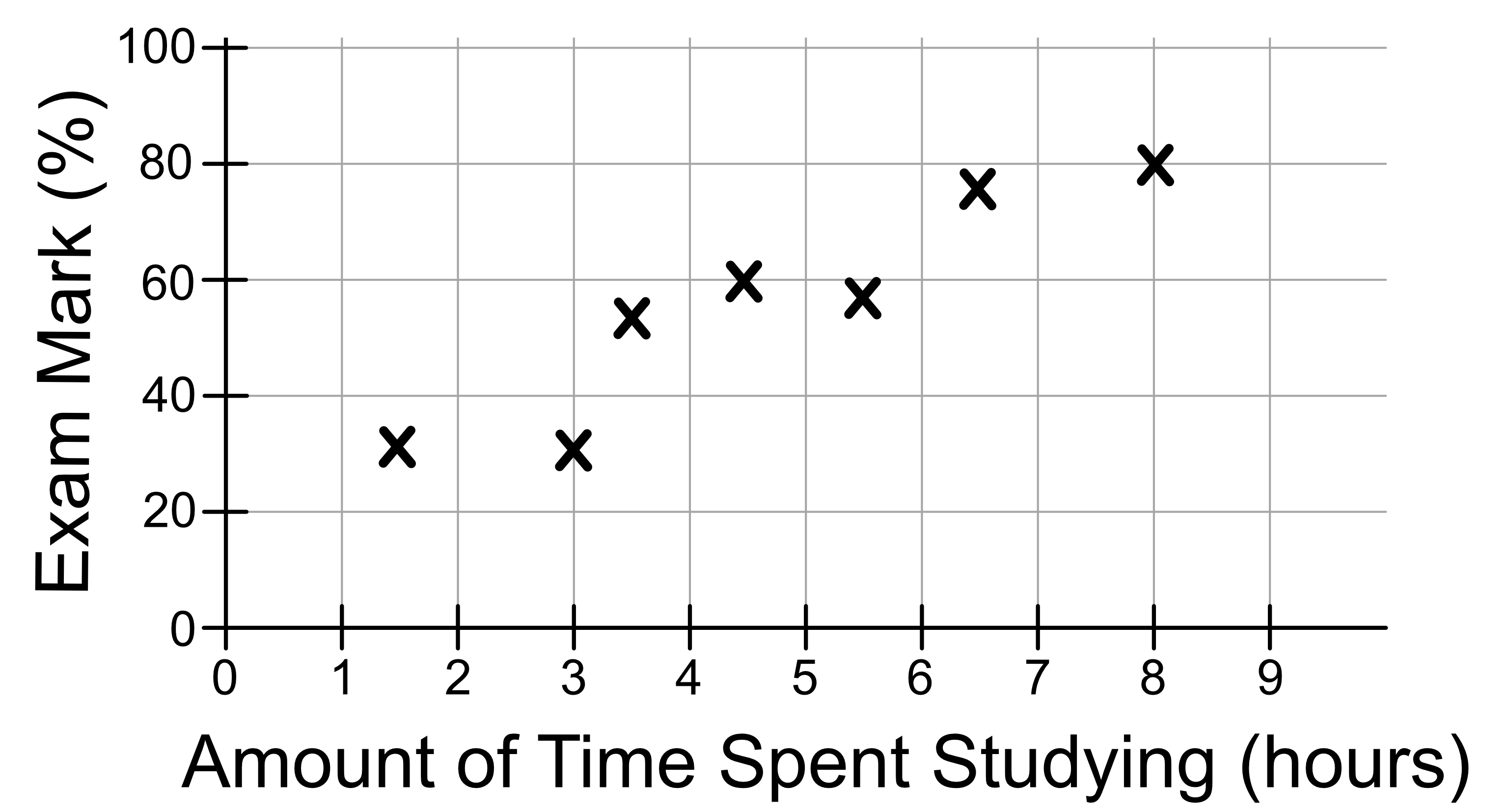 where \(\beta_0\) is the intercept of our line, which in this case is 17 and \(\beta_1\) is the gradient (rise divided by run) of our line, which in this case is approximately 8. \(x\) is our independent variable, the amount of time spent studying and \(y\) is our dependent variable, the exam mark. Therefore our model is: