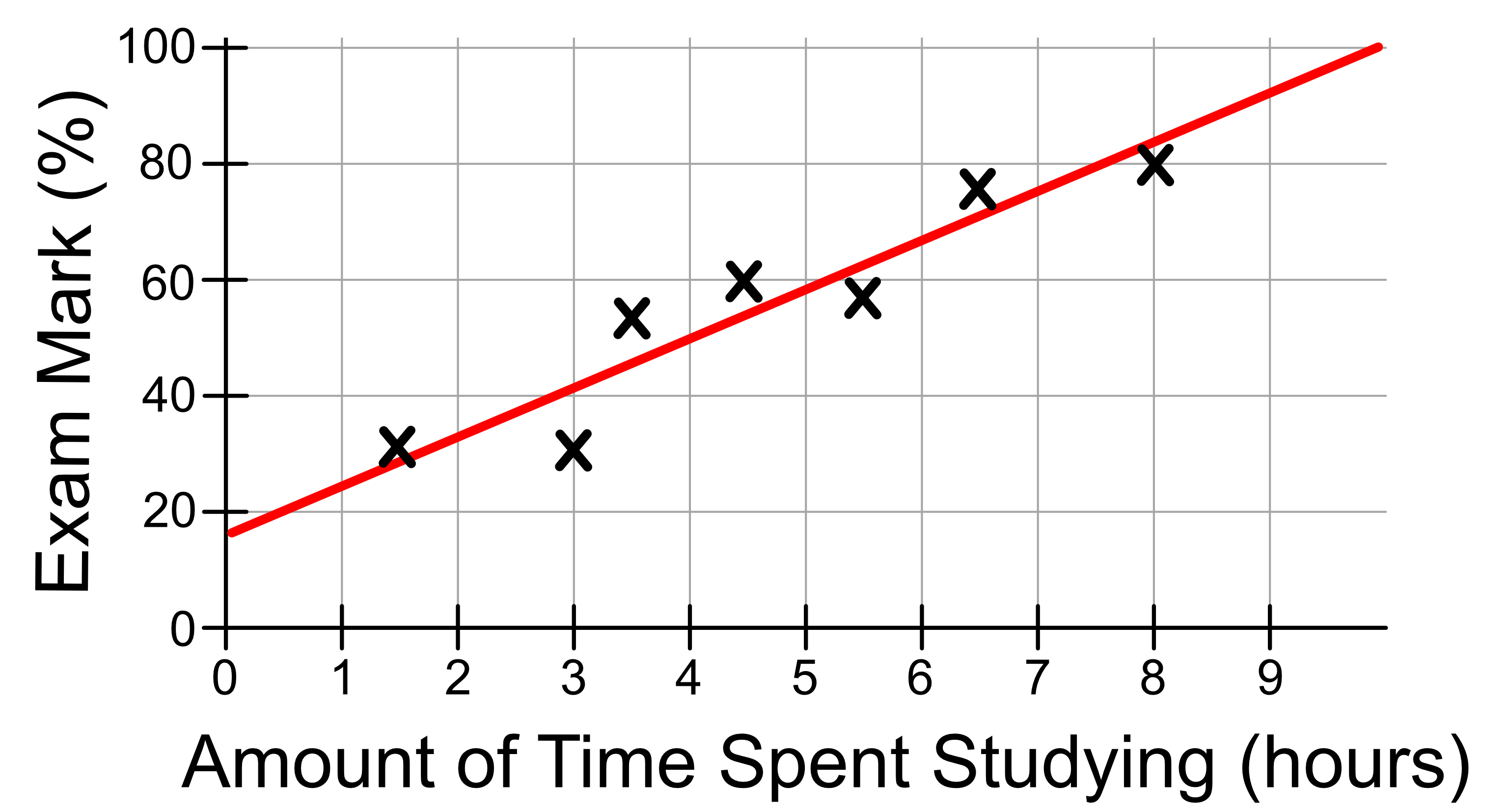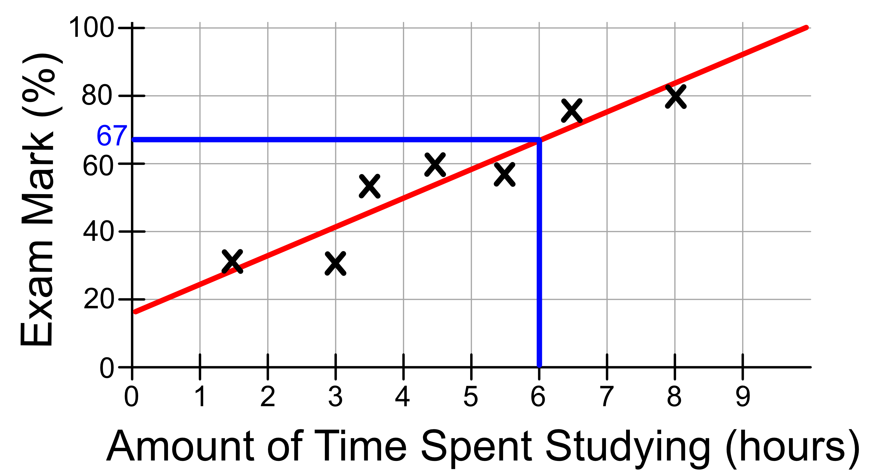 This means that we predict a student who has studied 6 hours for the exam will get a mark of 67. We can also estimate this number from the graph directly.