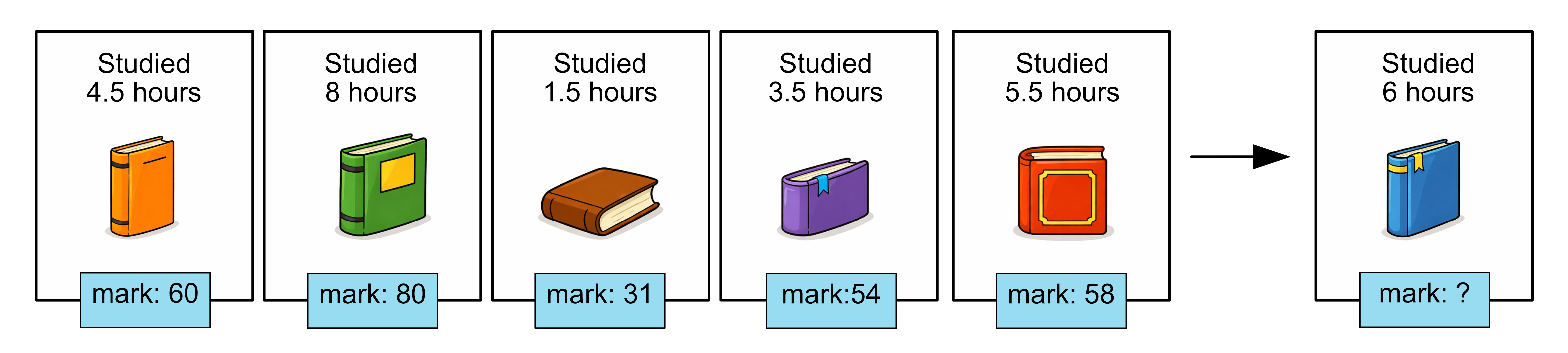 Using our model we can make predictions. For example, let’s estimate the mark of a student who has studied 6 hours for the exam. Using our model formula and plugging in \(x=6\), gives us: