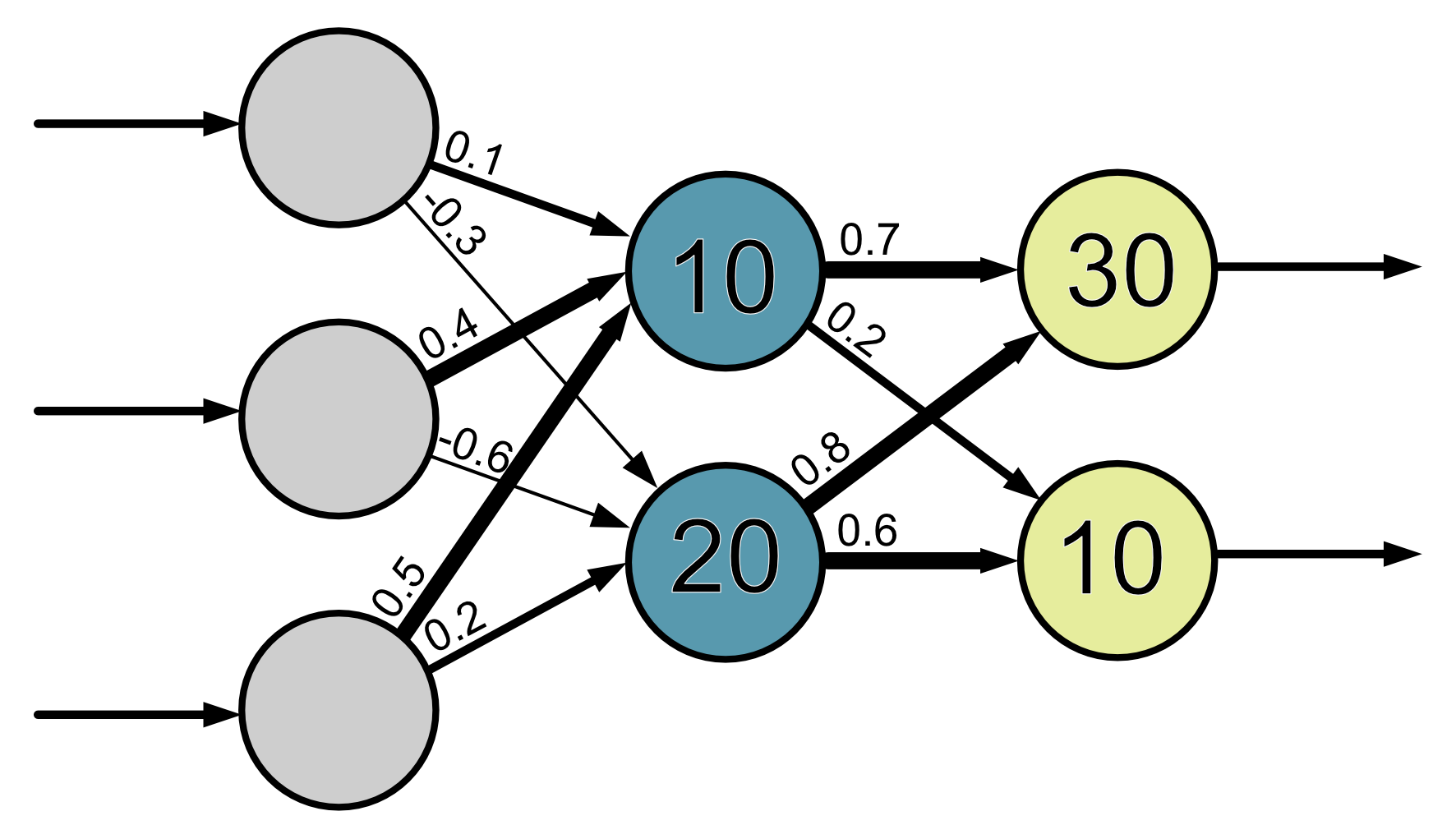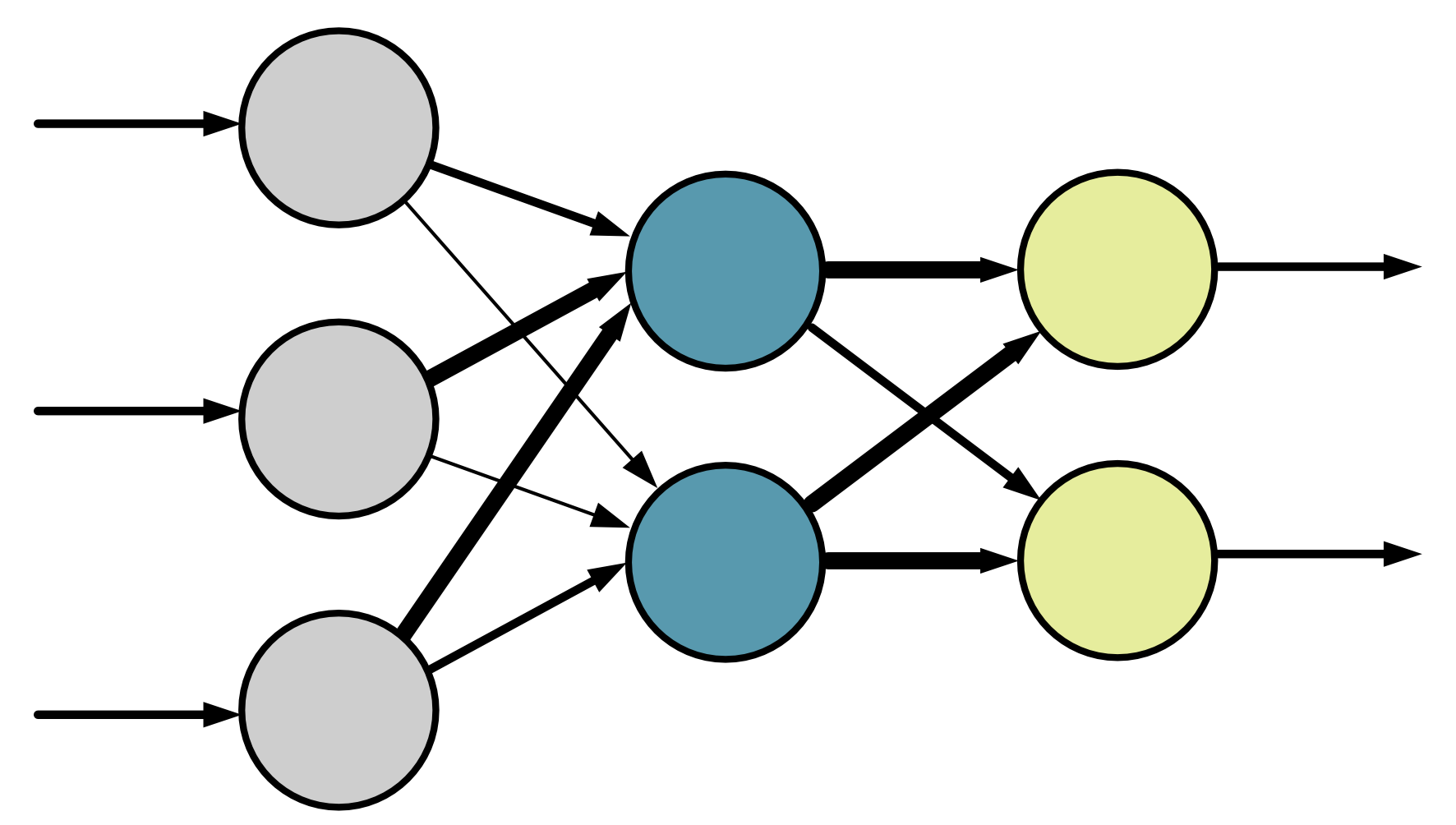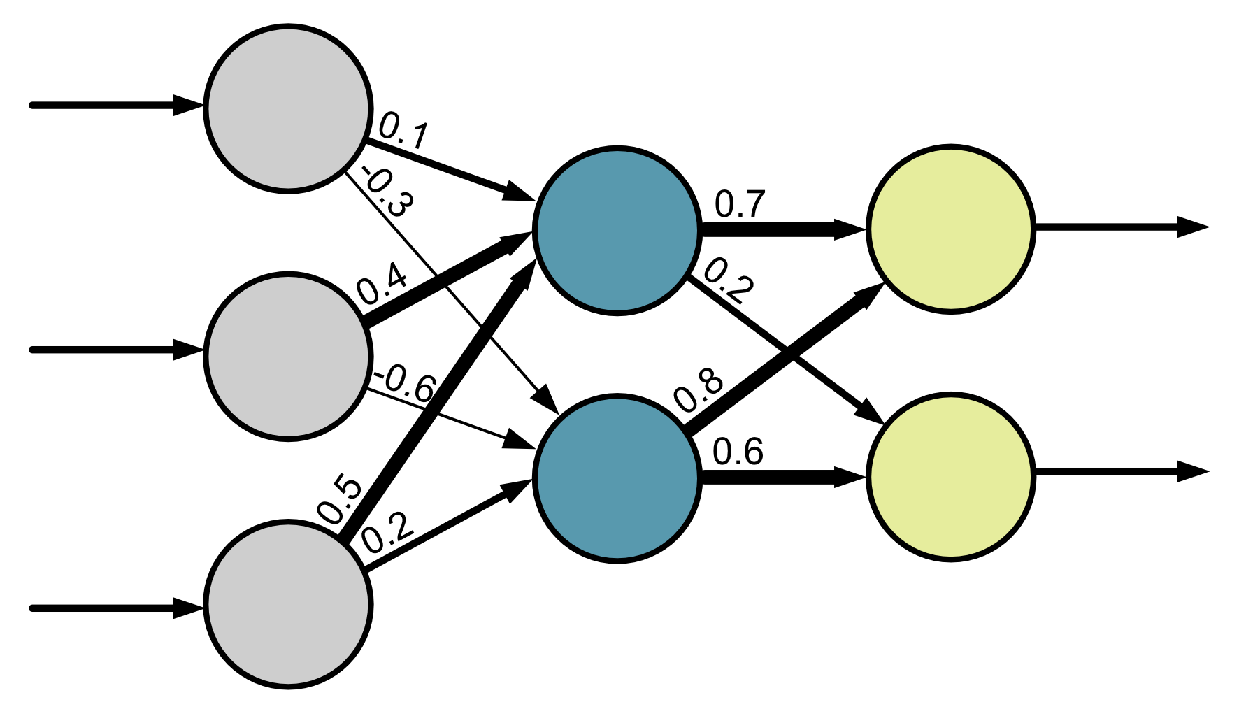In the brain the neurons are connected in complex networks and these connections, or pathways can be of different strengths. To mimic this in our artificial neural network we assign connections weights. The bigger the weight the stronger the connection. We only care about the weights between neurons. Consider the figure below. For visualisation we have changed the thickness of the connections to reflect the weights.