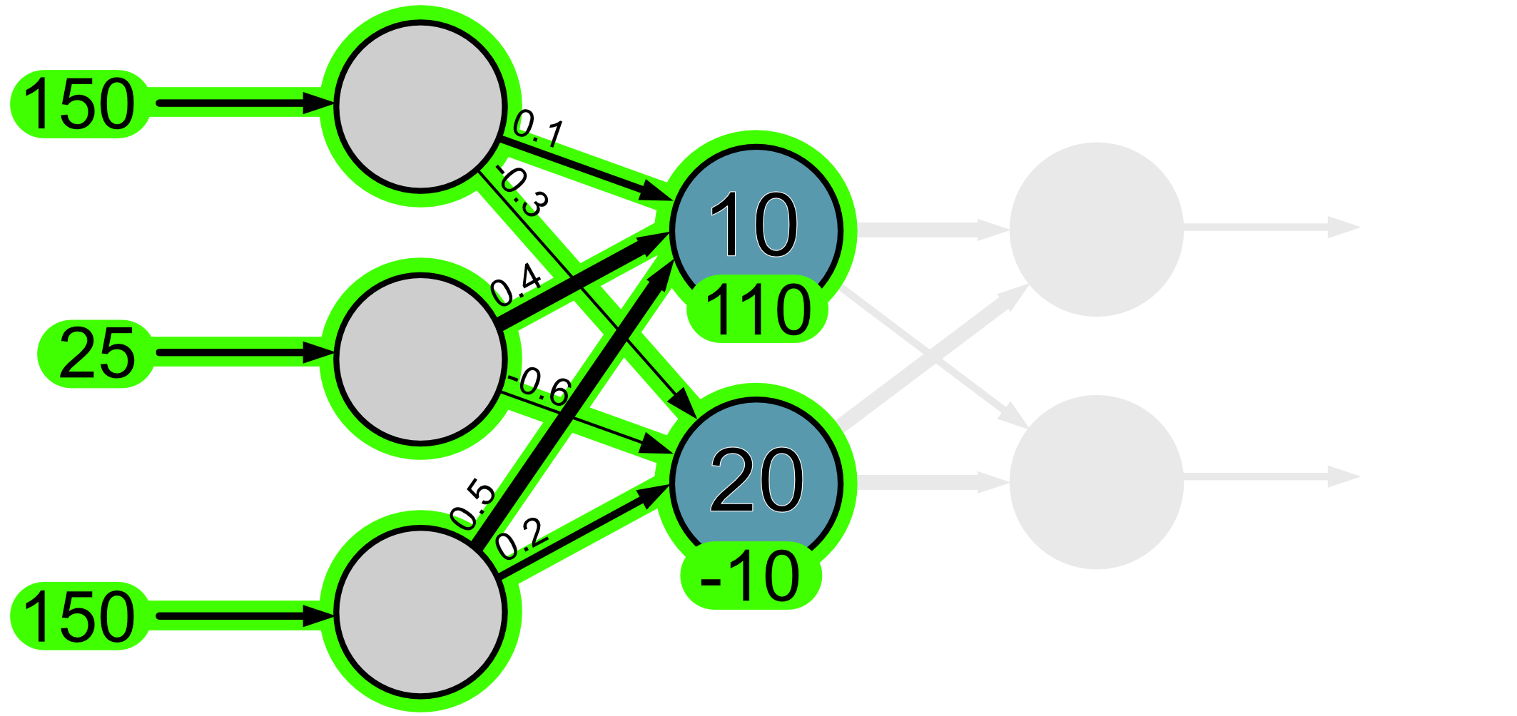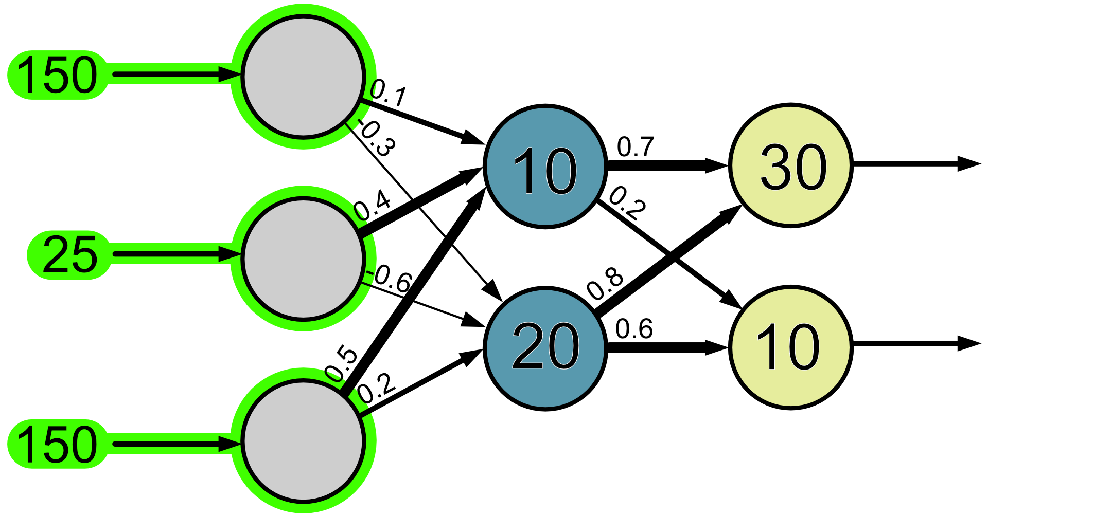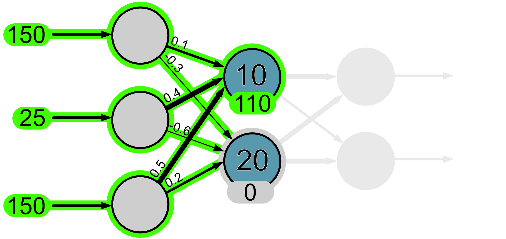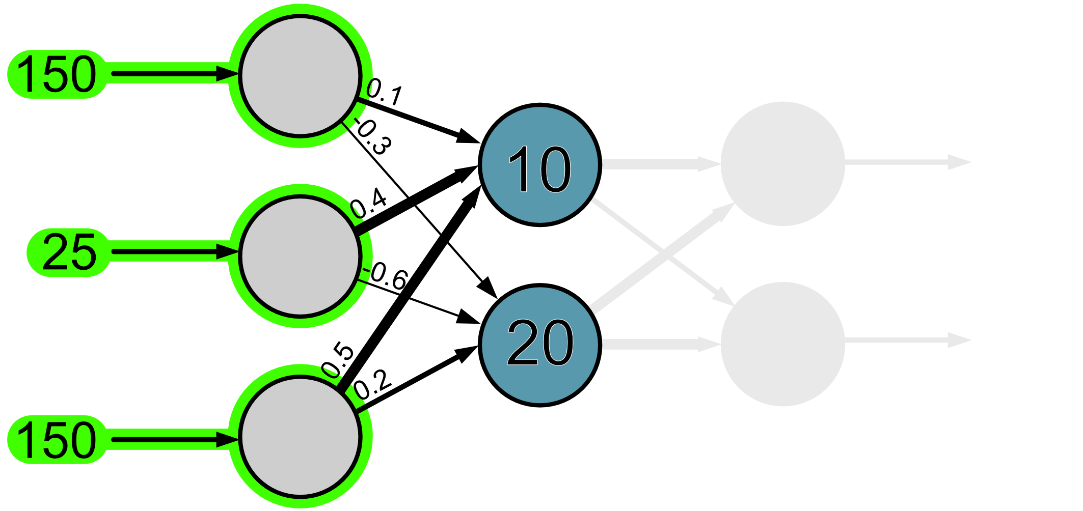 When we input information into our neural network, this information ‘flows’ through the network as a series of mathematical operations. Let’s give our network the input values 150, 25 and 150 and we’ll see step-by-step how they ‘flow’ through the network.