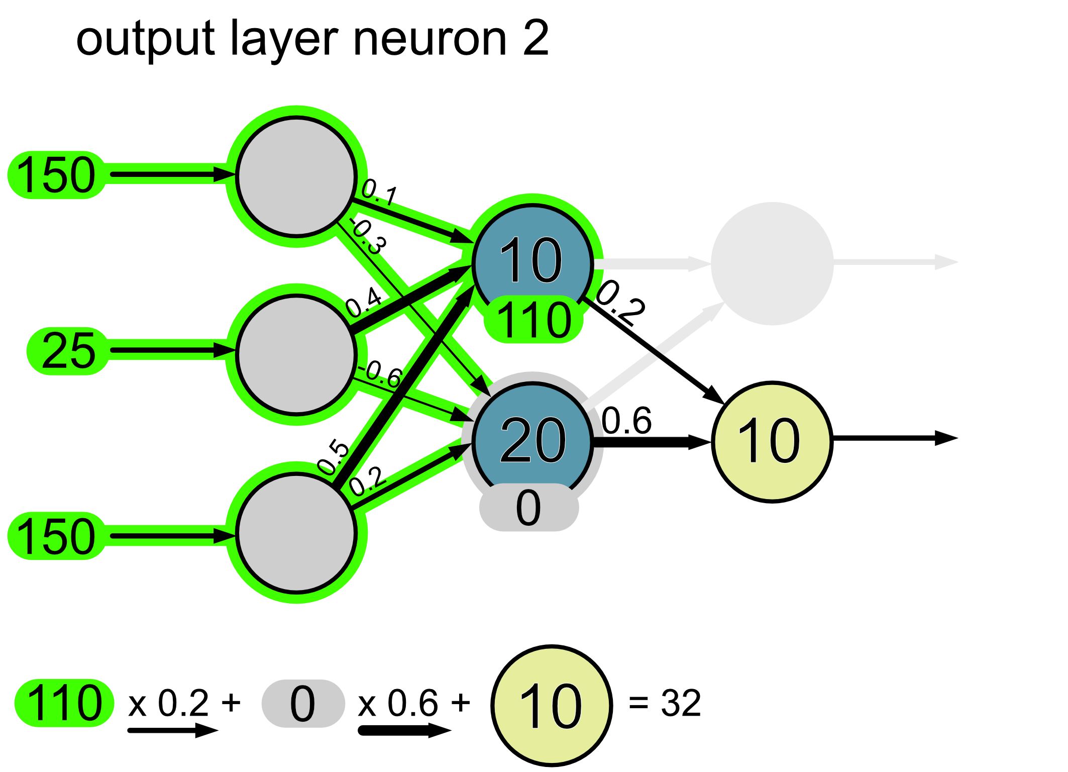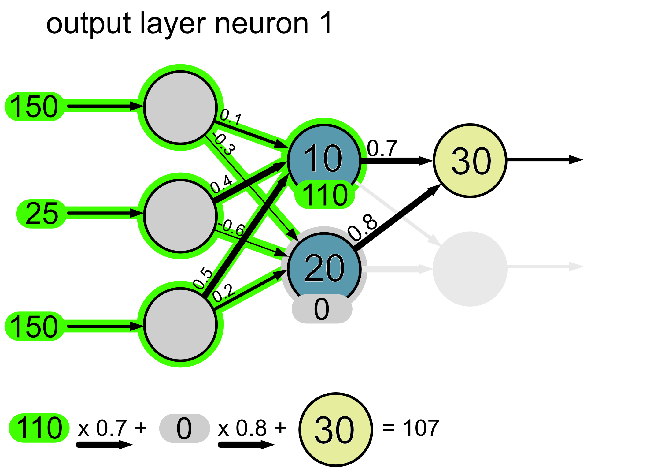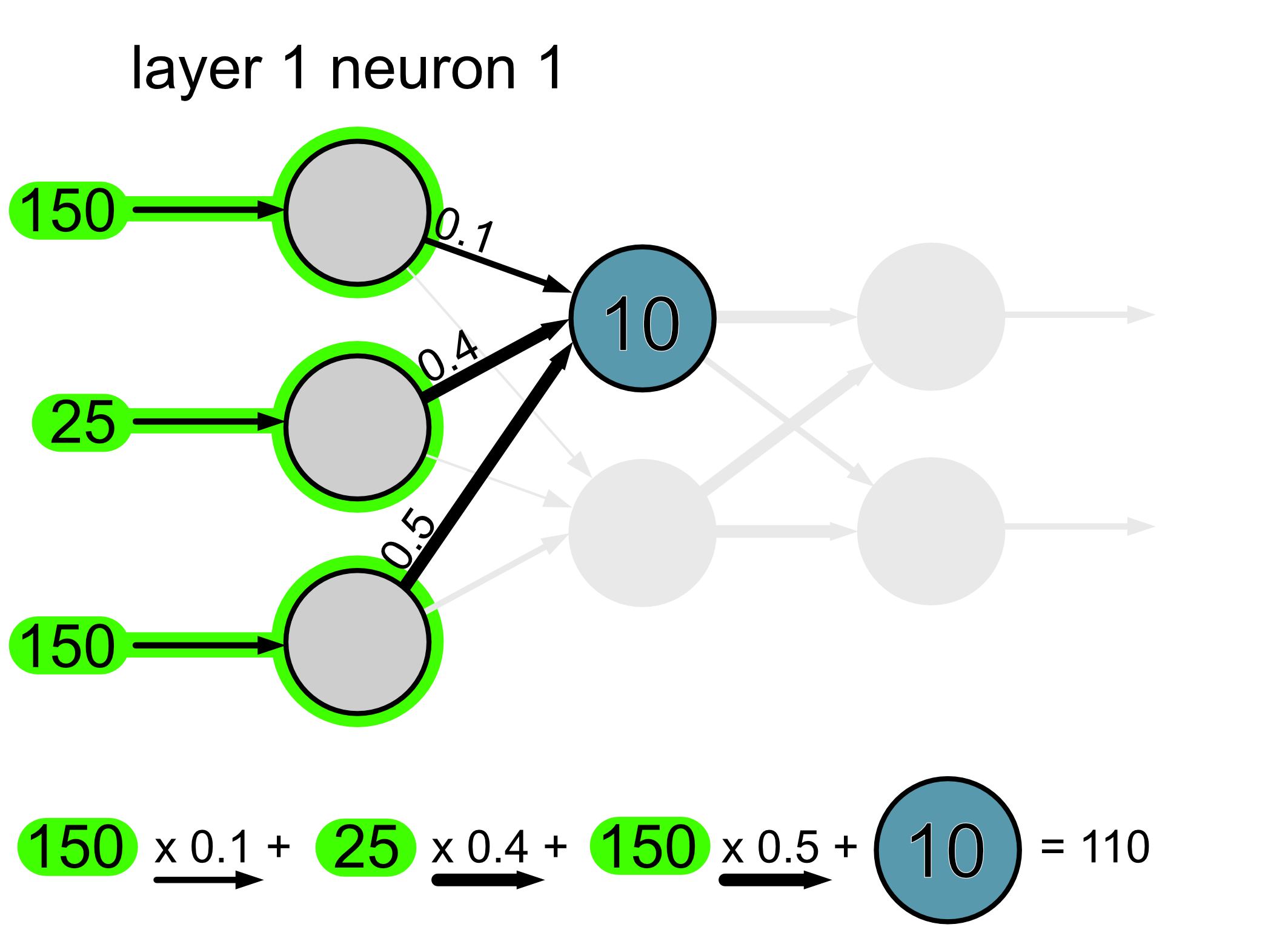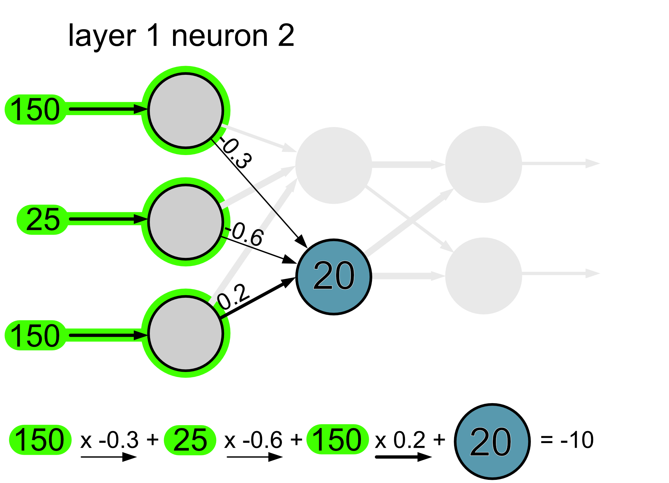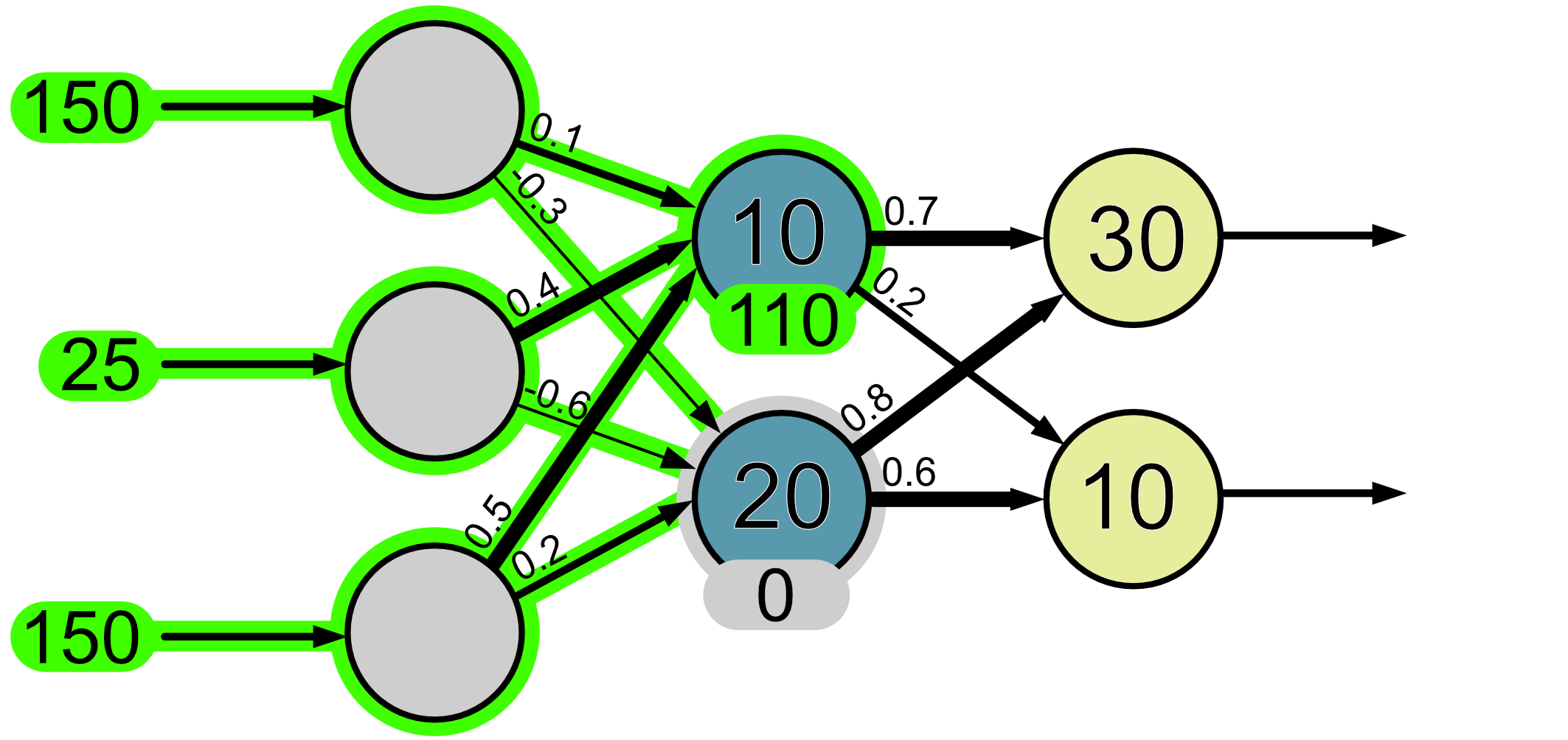 When we input information into our neural network, this information ‘flows’ through the network as a series of mathematical operations. Let’s give our network the input values 150, 25 and 150 and we’ll see step-by-step how they ‘flow’ through the network.