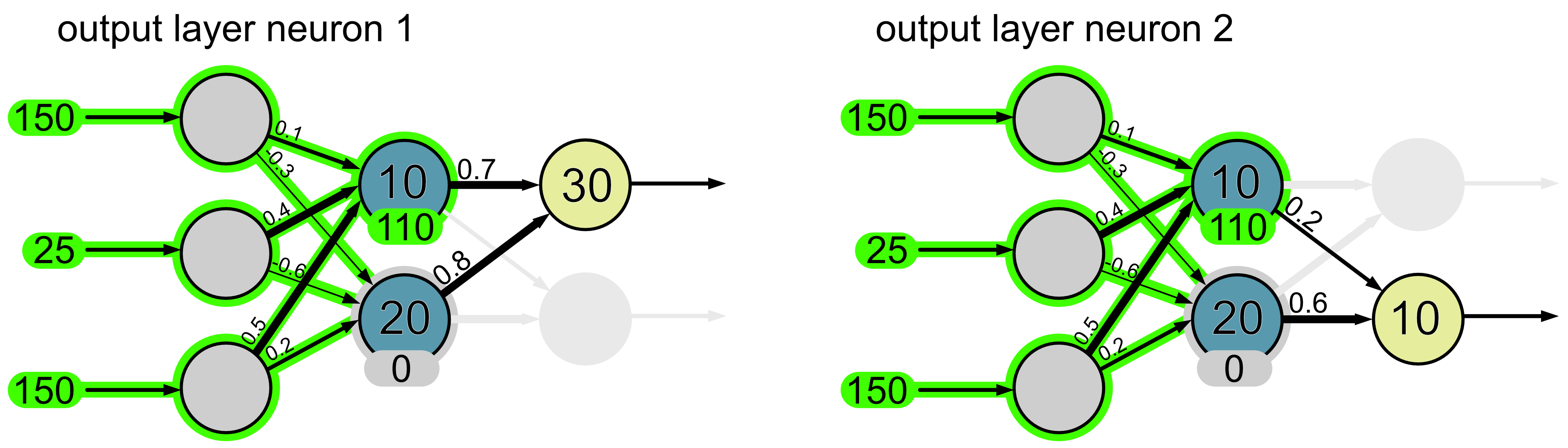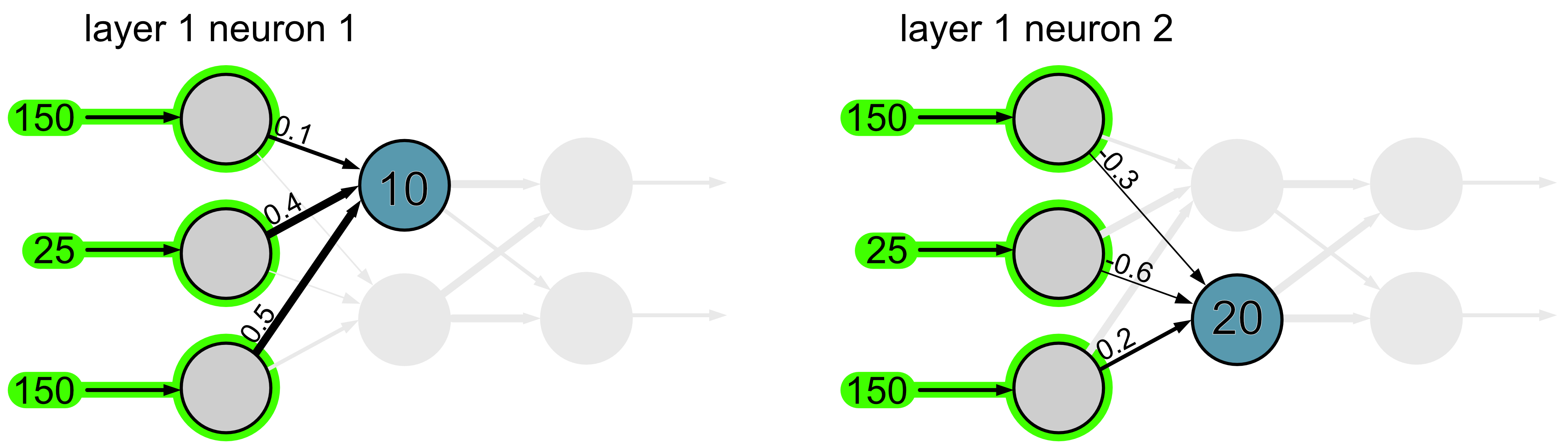 Next, we look at the neurons in the first layer. Since the information flows in the diagram from left to right, we don’t have to worry about anything to the right of these neurons.