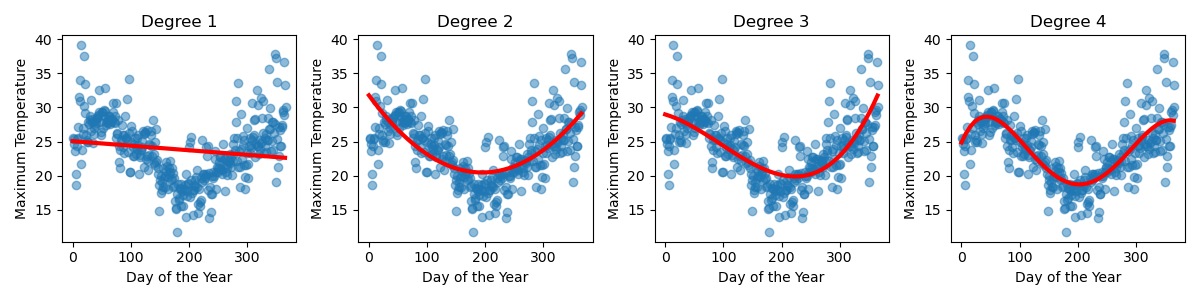 Sometimes it’s clear what polynomial degree you should select for your data. For example, our Sydney temperature data needed to be at least degree 4 to have enough ‘wiggles’ to capture the shape of the data.