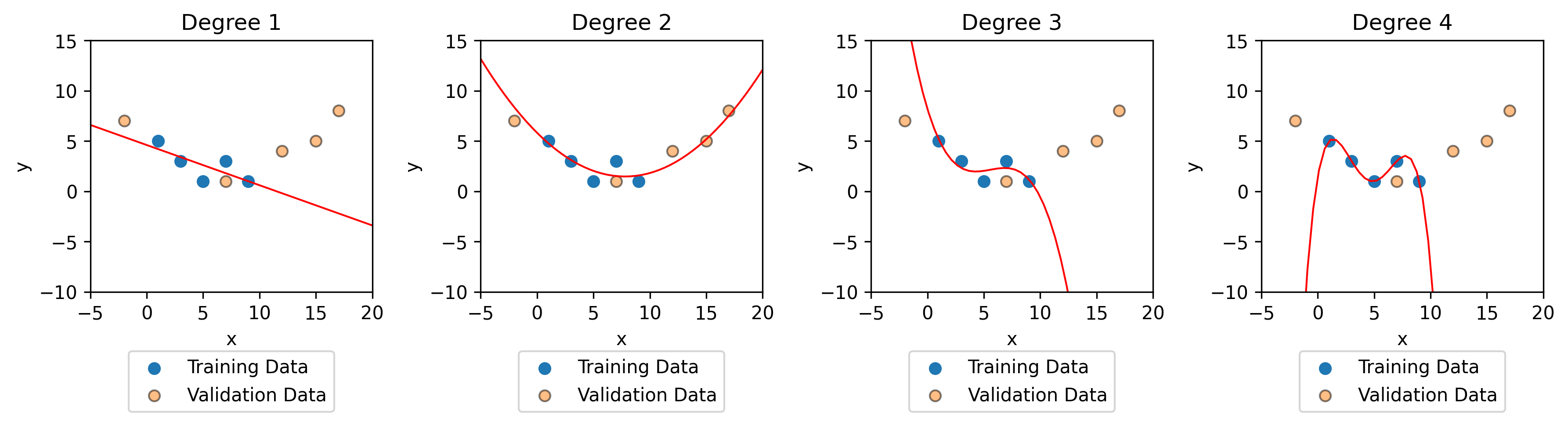Comparing the validation MSEs we can see that the polynomial of degree 2 performs the best on the validation data. This means that we expect the polynomial of degree 2 to perform best on new data.