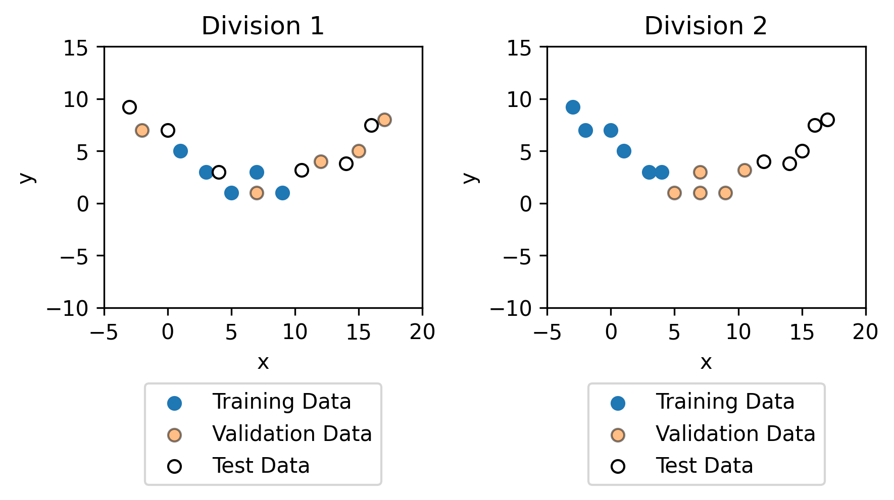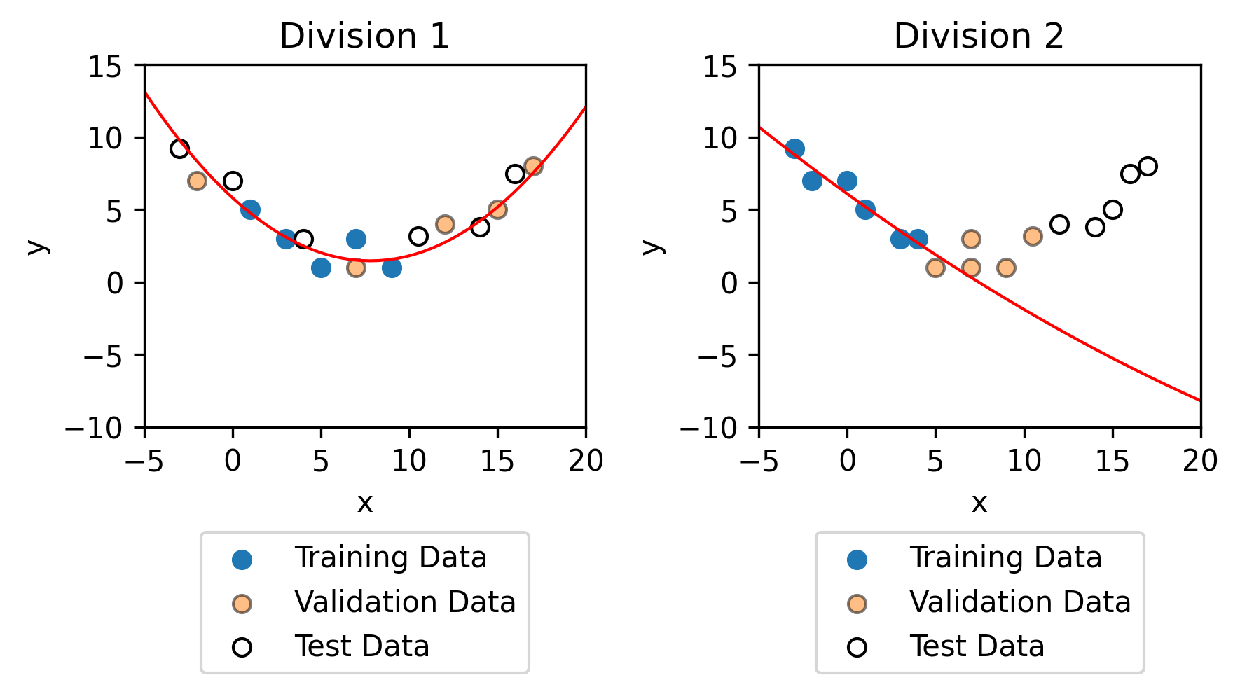 It is important, however that the training data, the validation data and the test data all try to capture the general trends of the data. For example, with the exact same data, but a different division between the training, validation and test data (as shown below).