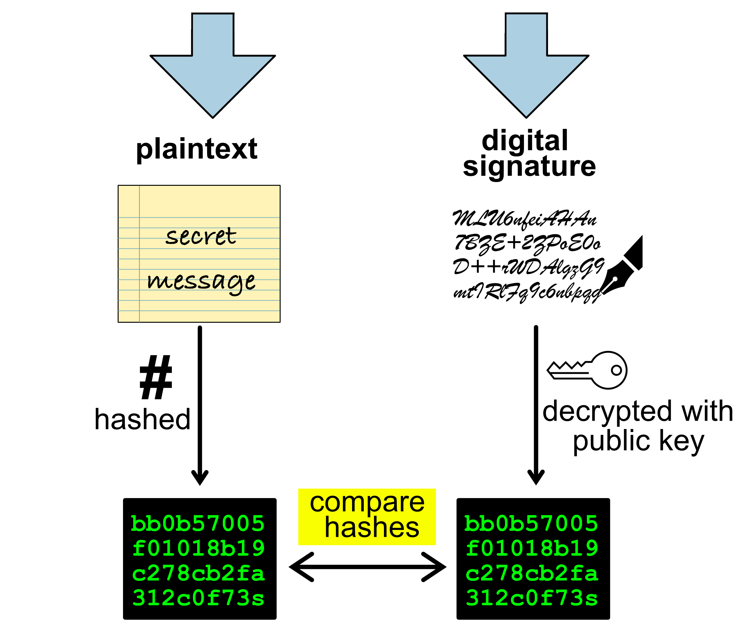 Compares the hash of the message with the hash from the signature.